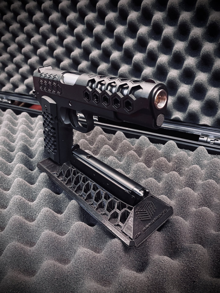 DK ARMAMENTS High quality light weight durable Airsoft pistol display stand. Perfect for those that want to display their Airsoft Pistol or want to enhance their current display cabinet or display racks. This item is suitable for those which simply want to display their Airsoft pistol on a mantel piece or other suitable home display area.