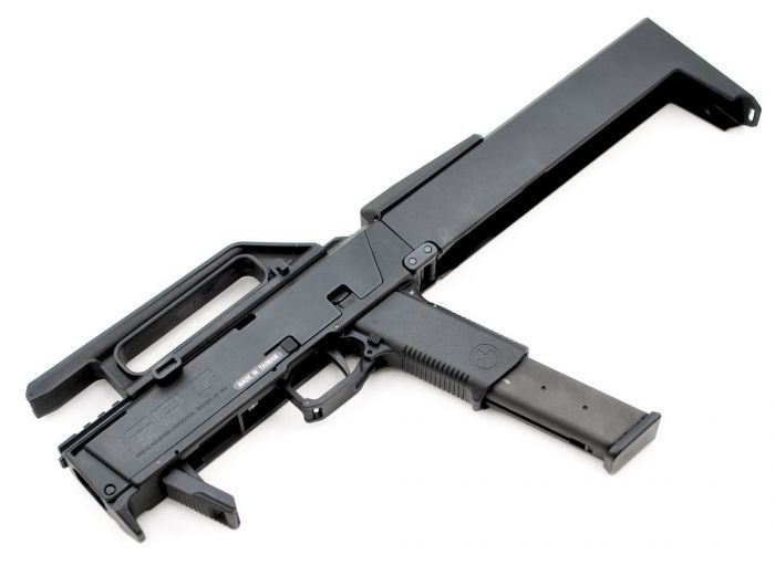 Conversion kit that can reproduce the one-motion foldable submachine gun FMG-9 developed by Magpul with the Tokyo Marui Glock gas gun.