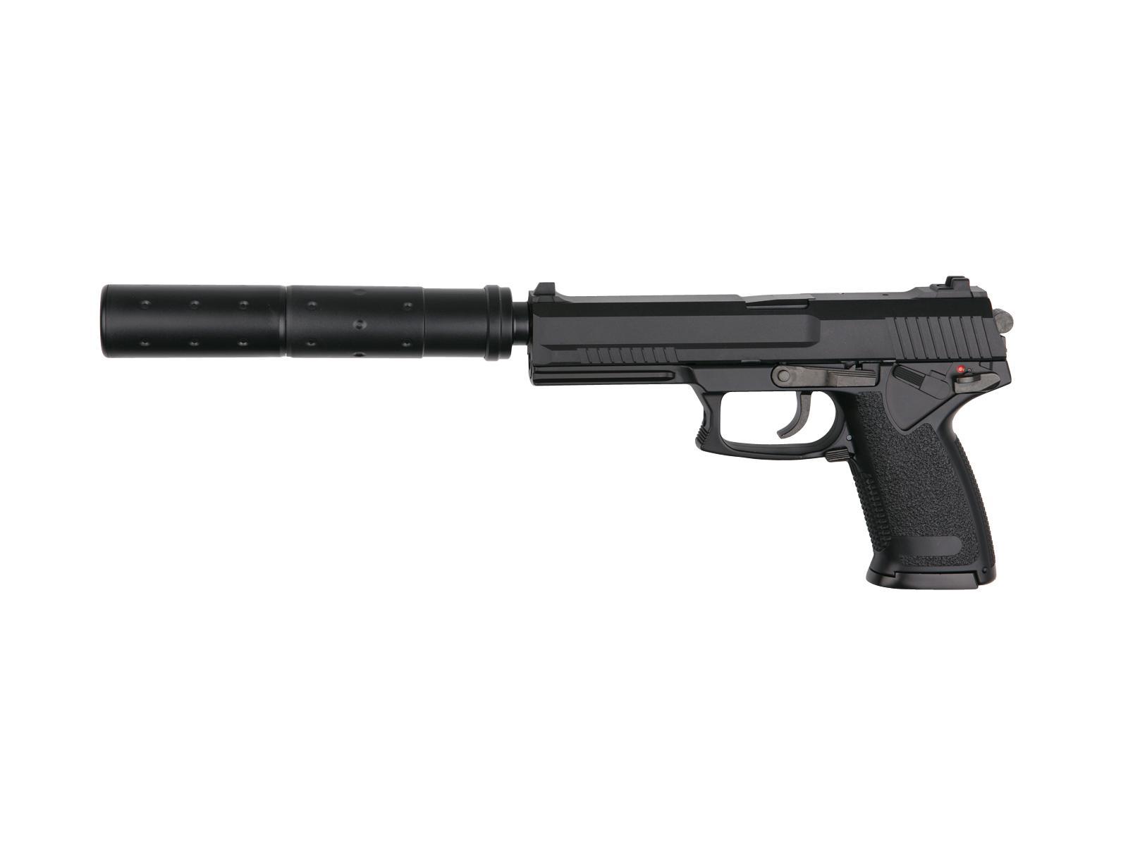 The MK23 Special Operations is an extremely powerful semi-automatic gas pistol and a very popular Airsoft pistol. The size alone demands respect and with the enclosed silencer makes for a formidable Airsoft pistol. It has a standard weaver/picatinny rail for accessories mounting and the fixed Hop-up combined with power secures a very accurate weapon.