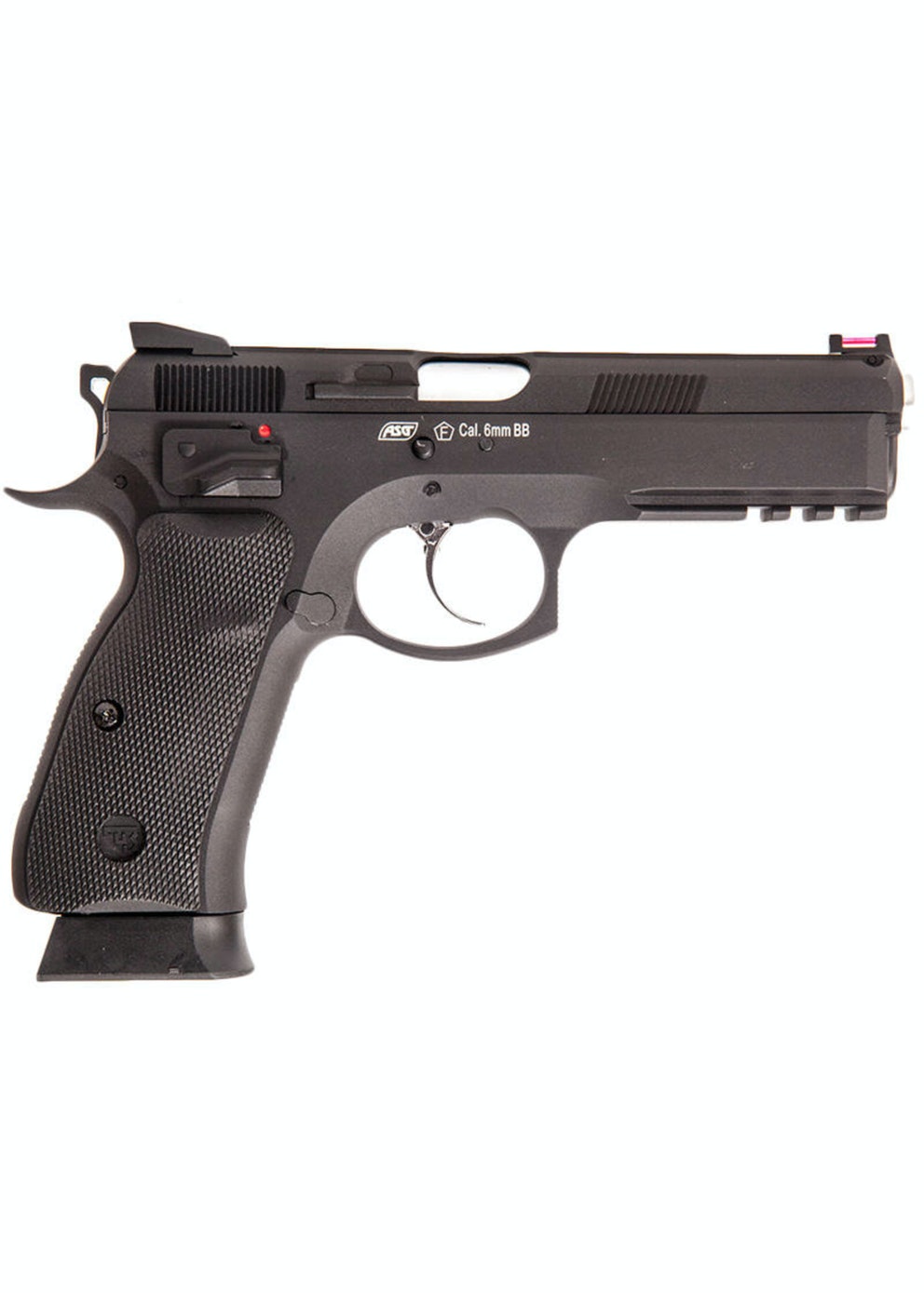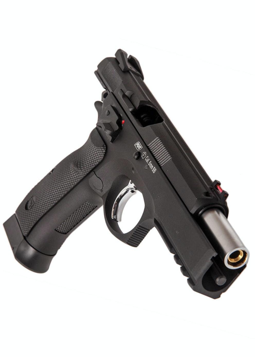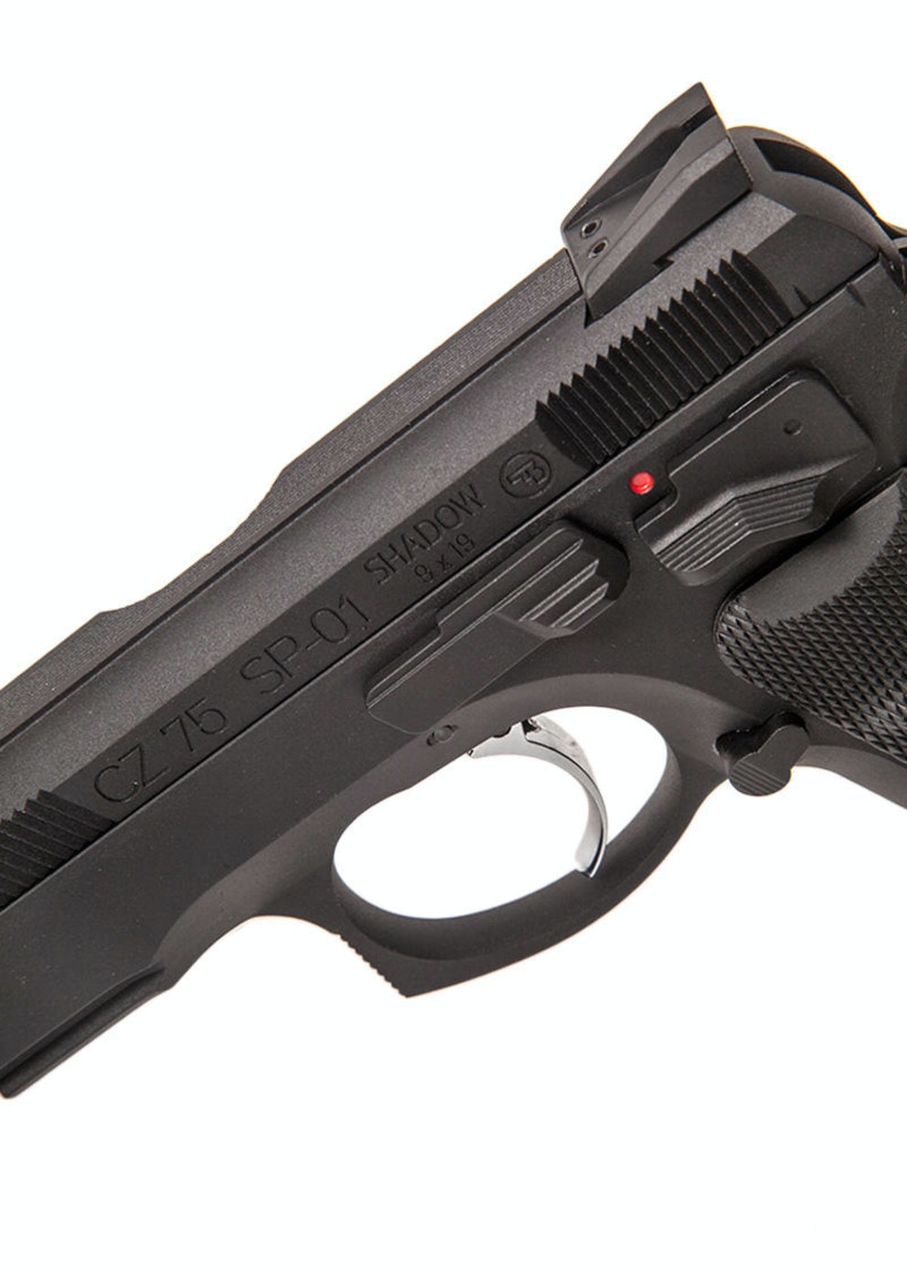 The CZ SP-01 SHADOW features a Two-Stage trigger, meaning that the weapon can be pre-cocked to fire when placed into holsters, making for a faster initial draw. The weapon has a front lower Rail enabling a range of accessories to be attached such as Pistol Torches and Lasers, Highlighted front Sight which is designed to amplify available light for darker shooting conditions. features an extremely accurate and very well-built representation of the real steel version. The externals of the replica are metal where they would be on the real-world weapon.