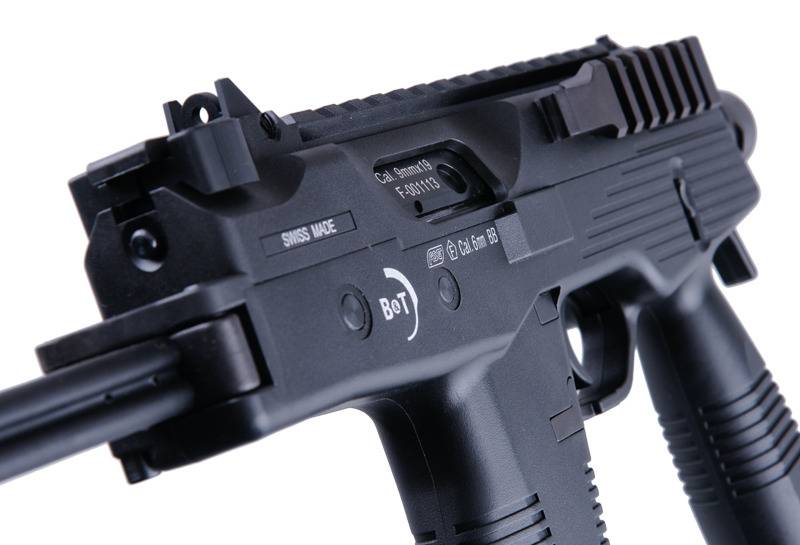 The B&T MP9 is a compact gas blowback machine pistol licensed by the original manufacturer Brügger & Thomet, Switzerland. The A1 version has an integrated front grip and a folding stock and the whole body is made of reinforced fibre polymer.
