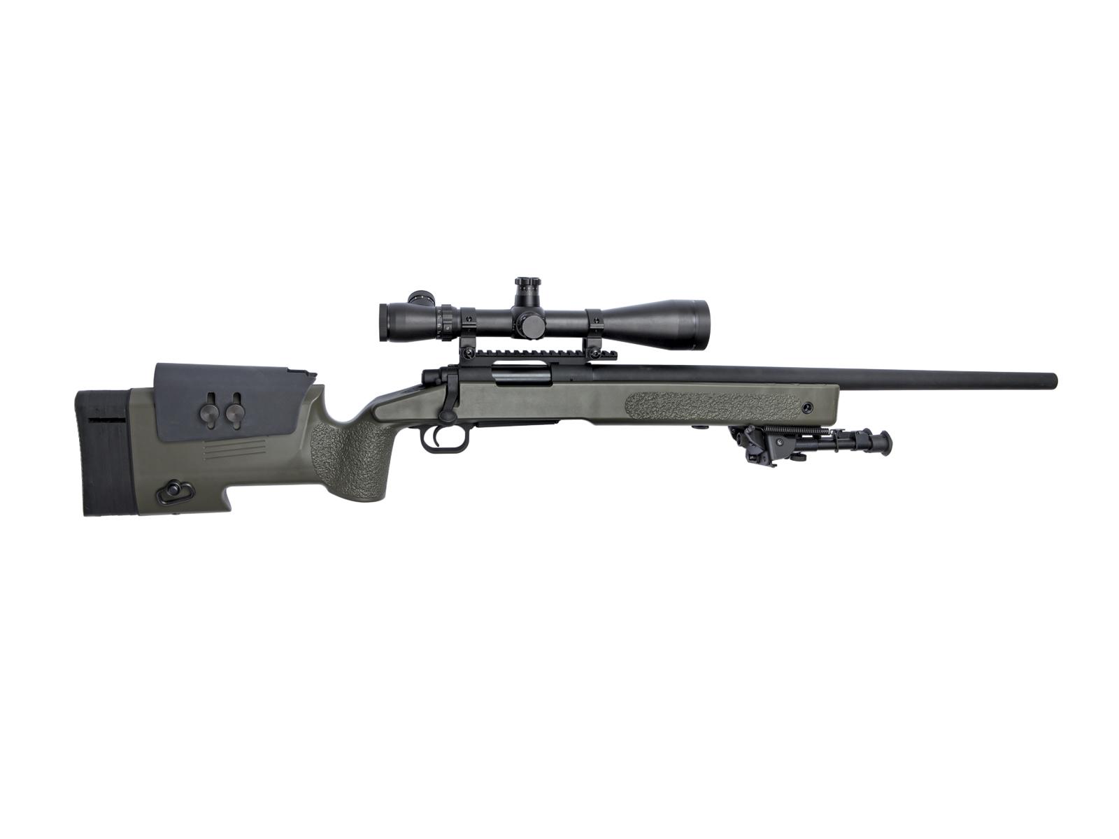 The M40A3 is a fully licensed bolt action airsoft sniper rifle. It is a 1/1 scale replica of the united States Marine Corps trusted sniper platform. It has all the standard M40A3 features, such as an adjustable cheek rest and stock to make it more comfortable for the user and a rail for mounting scopes.