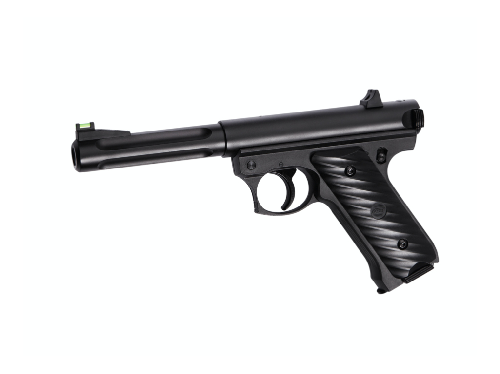 The CO2 powered MK II is an updated version of the classic MK I design. The full metal barrel and receiver with metal internals provides a solid construction that delivers reliable performance, great for a backup gun. The barrel is fluted and features a self-illuminating fiber optic front sight. The handle is made with comfortable fiber reinforced plastic and the grip scales have smooth scalloped cuts resulting in a gun that’s comfortable to use and dependable.