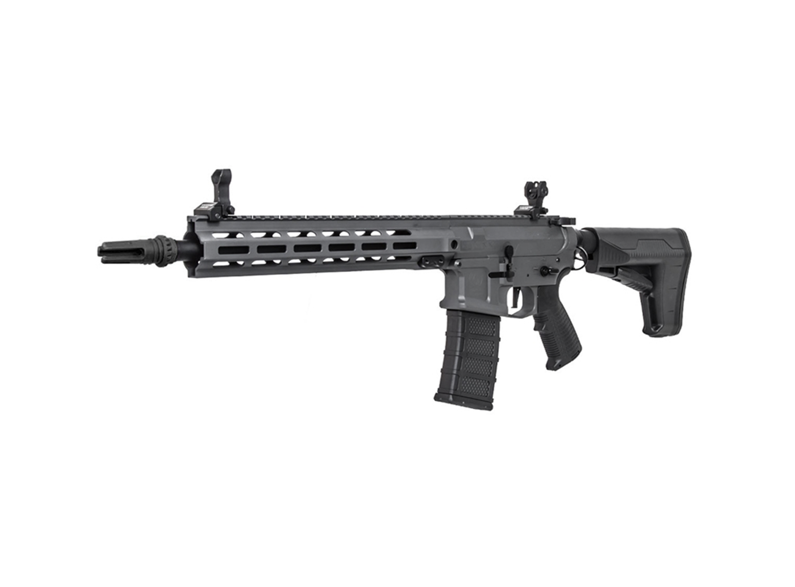 Further, the upper and lower receiver are metal in a billet style that gives you a super-aggressive look, and also makes sure both receivers match up perfectly. The new Ambidextrous charging handle adds functionality to the exterior, allowing you to access your hop up with either hand, and the bolt can be manually locked open with the bolt release on the left of the receiver. The rifle comes along with other common ambidextrous features, such as fire selector and magazine release. Rounding out the externals are the new three-prong suppressor-ready flash hider (which can fit the Classic Army Fast Attack suppressor) and the B.A.Stock. With the B.A.The stock you get huge battery storage capabilities, with the ability to keep up to 3 batteries in the stock at once. A flat trigger is also installed that allows for a quicker response and trigger pull.