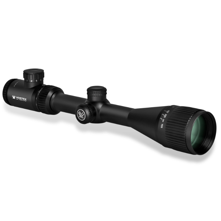 The Vortex Optics Crossfire II 6-18×44 AO Riflescope is designed for long-range shooting. It features an adjustable objective (AO) for precise image focus and parallax correction. The V-Brite MOA reticle offers an illuminated center dot for better low-light performance, making it ideal for hunting and shooting in various conditions.