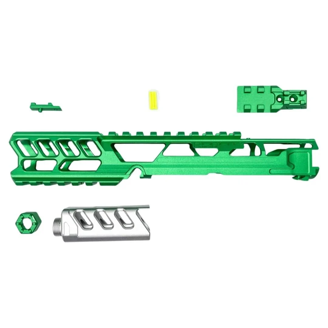 Package Contents : CNC Upper *1 CNC Decorative inner body *1 CNC Cover *1 CNC Front sight *1 CNC Rear sight *1 Green fiber (2mm*60mm) *3 Stainless steel Hex Socket Flat Head Cap Screws : m2.5×8 *1 m3x5 *2 m3x8 *2