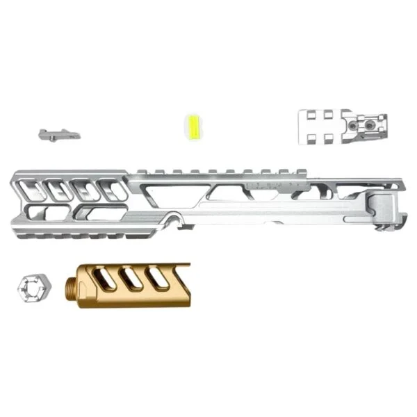 Package Contents : CNC Upper *1 CNC Decorative inner body *1 CNC Cover *1 CNC Front sight *1 CNC Rear sight *1 Green fiber (2mm*60mm) *3 Stainless steel Hex Socket Flat Head Cap Screws : m2.5×8 *1 m3x5 *2 m3x8 *2