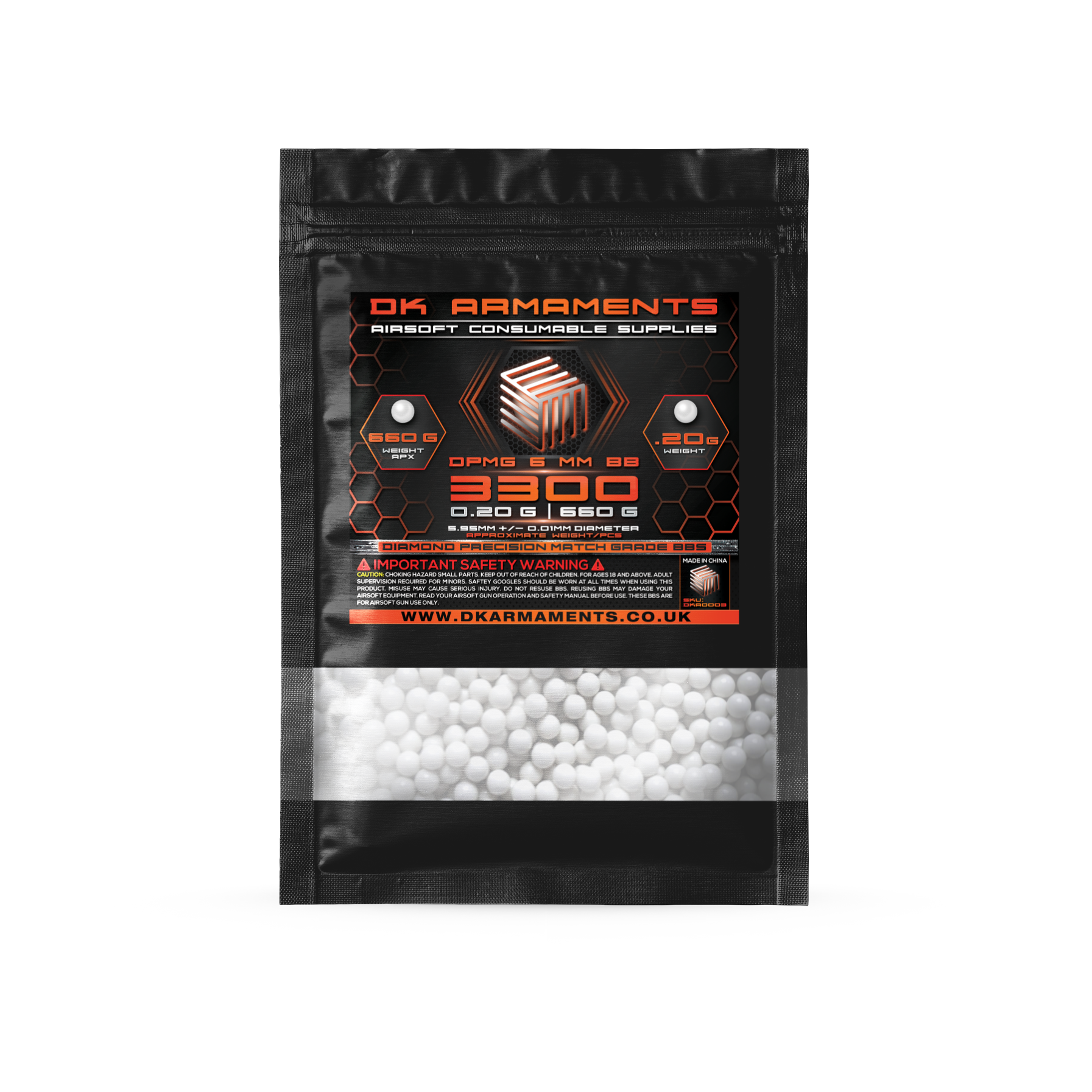 DK ARMAMENTS 0.20g Diamond Precision Match Grade (DPMG) BBs offer the Airsoft player consistent precision and ultimate performance. It is constructed from high-quality high-density polymers and is double polished to provide its high gloss finish. The polishing process ensures that our BBs are fully spherical in shape with no ridges, blips, or seams delivering exceptional aerodynamics.