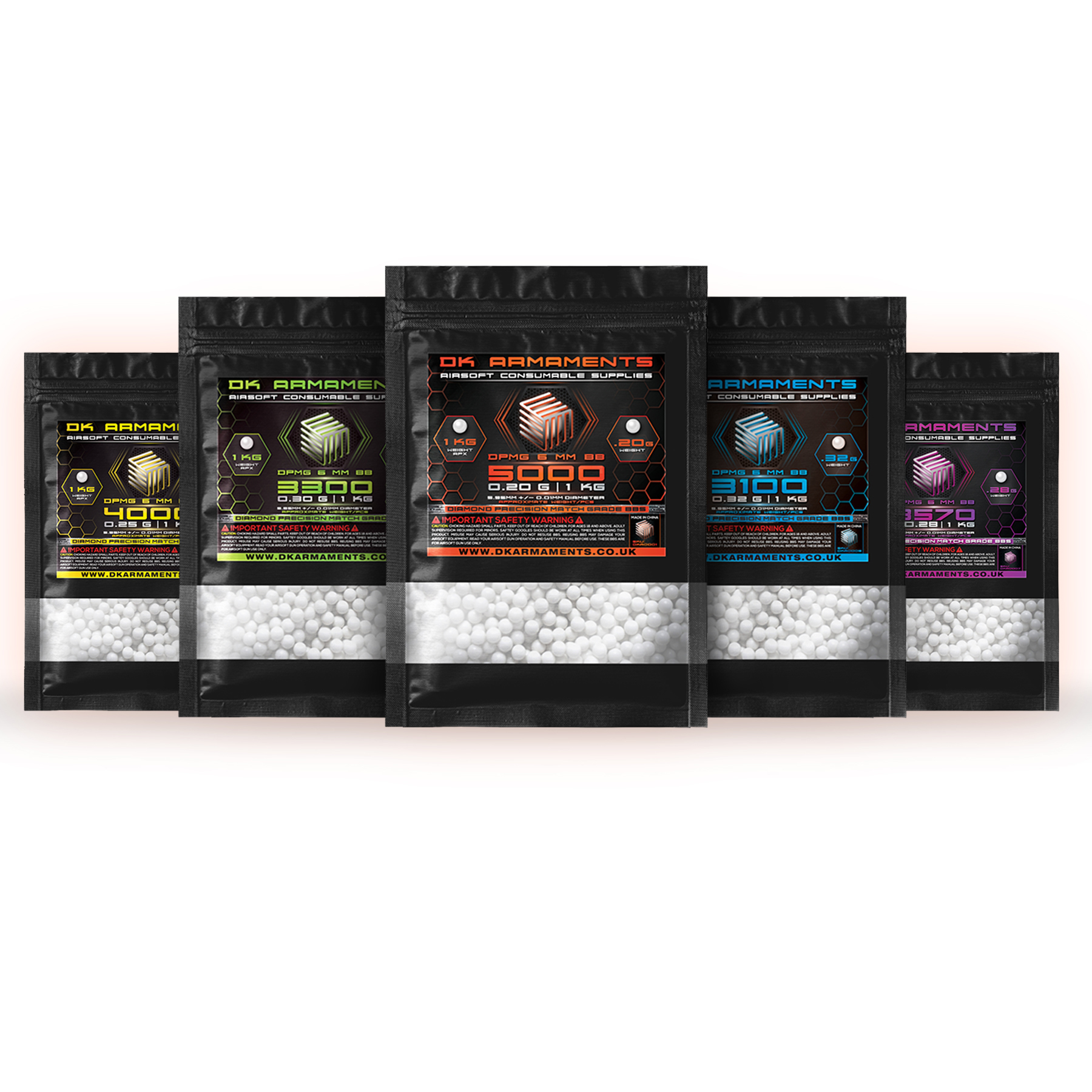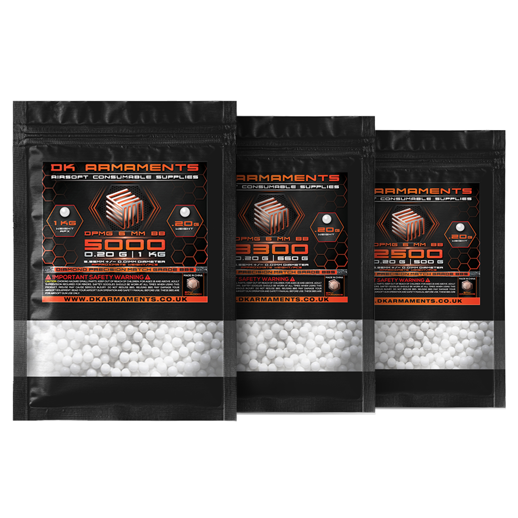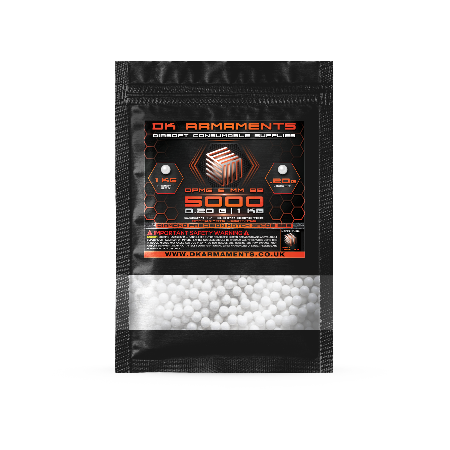 DK ARMAMENTS 0.20g Diamond Precision Match Grade (DPMG) BBs offer the Airsoft player consistent precision and ultimate performance. It is constructed from high-quality, high-density polymers and is double polished to provide its high gloss finish. The polishing process ensures that our BBs are fully spherical in shape with no ridges, blips, or seams delivering exceptional aerodynamics.