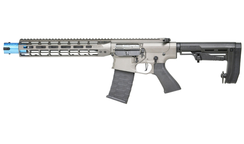 The Falkor Blitz SBR from EMG starts with a metal upper and lower receiver unlike any other AEG on the market. With extensive tactical styling, this receiver is barred none. In addition to the unique styling of the Falkor, nearly every piece is ambidextrous including the magazine catch, bolt release, short throw fire selector and a Falkor Mach 15 Ambi-charging handle is also present to complete the high-end look of this rifle. A Super Dynamic 3-Gun style straight trigger gives the operator a unique and fast trigger manipulation. The Flared Magwell grip features ridges on the front for operators who prefer a magwell style grip on their rifles. It should also be noted that the upper receiver sports a unique style that will set the look apart from every other M4 variant on the market. Moving onward you will find a flush top rail leading into FALKOR Fatty Free-Float 11.5 MLOK™ Handguard, allowing the end-user to install any MLOK compatible accessories and rail segments. A textured, slim profile motor grip paired with the Minimalist Stock not only completes the look of the rifle but makes it an extremely comfortable piece to shoulder and field.