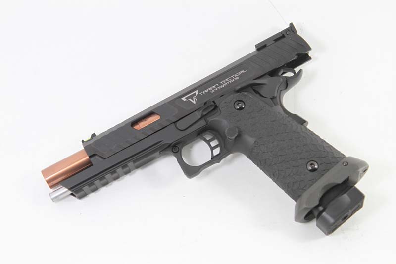 Highly detailed CNC machined aluminum slide officially licensed STI roll marks and TTI laser engraved markings. Full CNC machined aluminum frame with molded reinforced polymer grips. Used by none other than John Wick himself, aka Baba Yaga / The Boogeyman /The man you send to kill The Boogeyman. The grip features a Molded DVC Stippling pattern that provides a comfortable, slip-resistant grip. The CNC precision barrel has a rose gold finish (imitation Bronze BLC) coating. The Pistol also features TTI professional slide with integrated design lightening cuts to help the slide cycle faster with less felt muzzle flip and features a flared mag well to aid in quick tactical reloads and includes an extended magazine as standard with an extended magazine release. The STI/TTI features a unique target system for better target acquisition utilising fiber optic front iron sight.