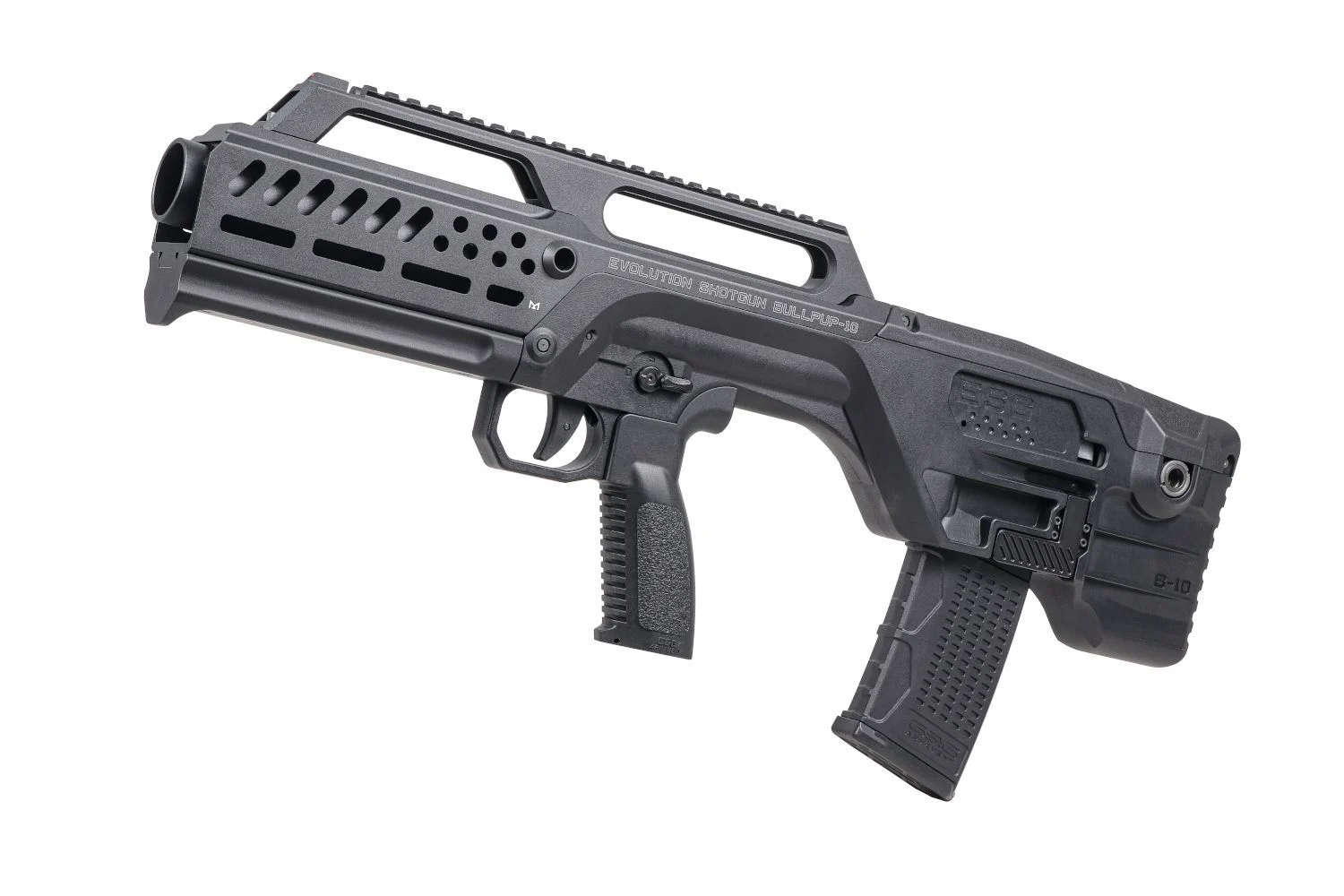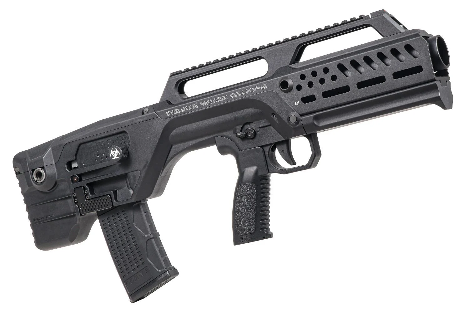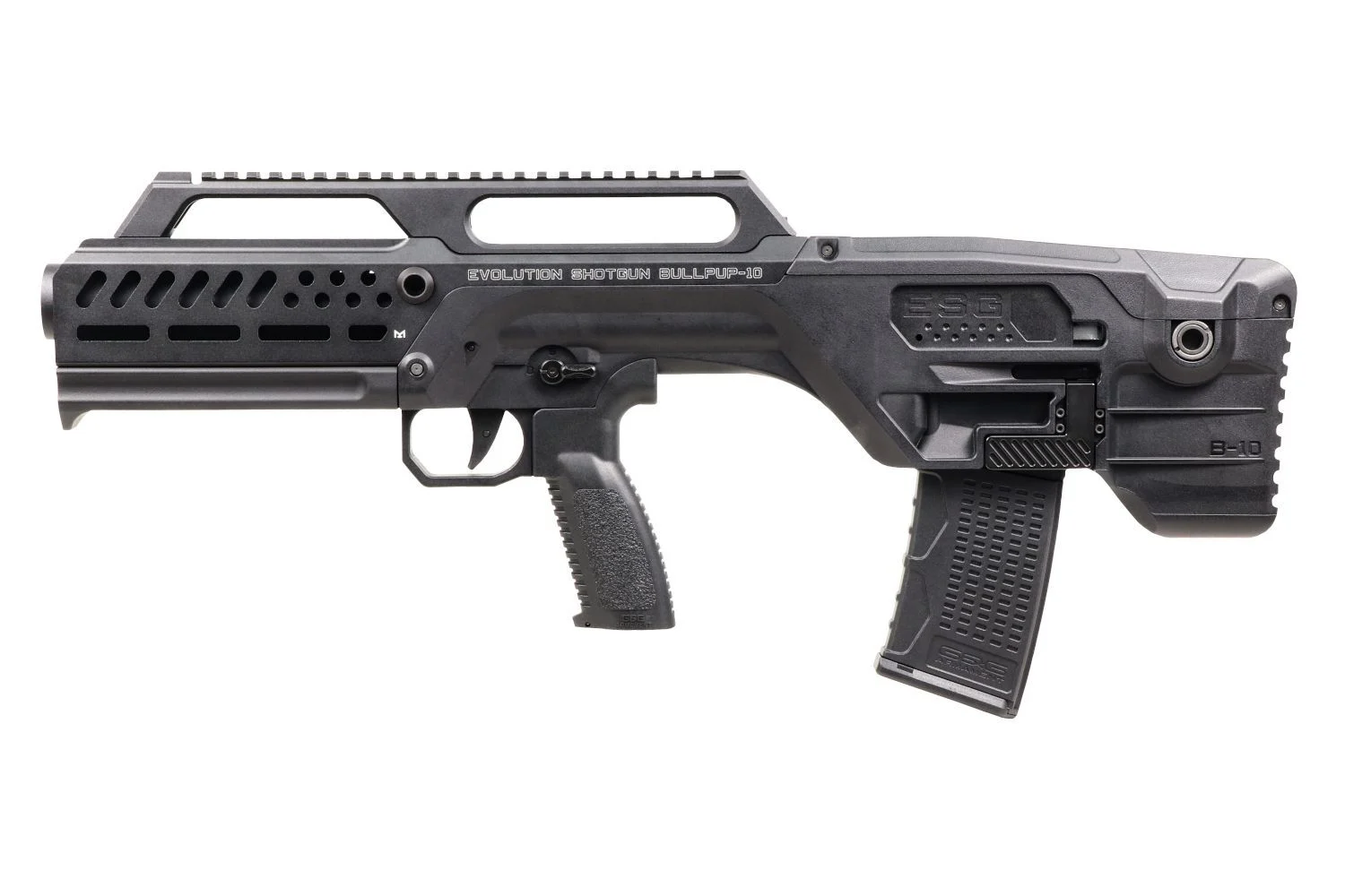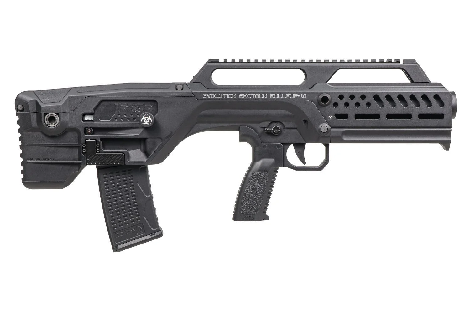 The G&G ESG B-10 Evolution Bullpup 10 Round Shotgun is the evolutionary bullpen style barrel 5 or 10 round shotgun powered by gas and takes a AEG Magazine.