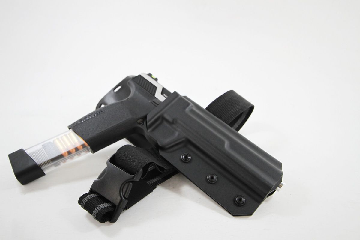 Our DC-1 Series Piranha Holsters follows the lines and the contours of this aggressive race style gun. It has been designed using in-house scans of the actual weapons, they are then formed and finished by hand. Following rigorous testing, we know each and every holster will hold up to even the most brutal of play styles.