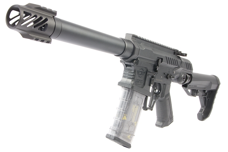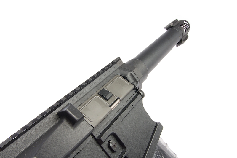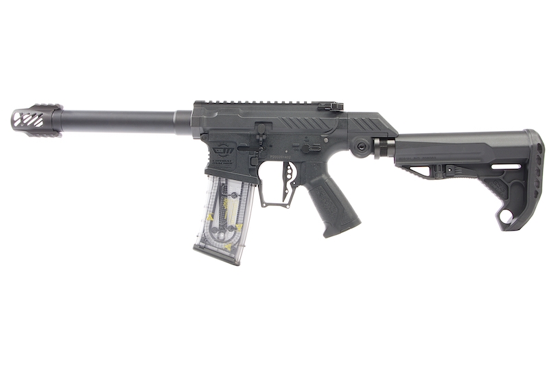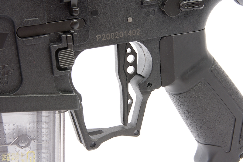 BEING SPECIALLY DESIGNED FOR SPEEDSOFT IT IS, AS ITS NAMESAKE SUGGESTS, DESIGNED FOR SPEED. THE BARREL IS A SIMPLE SMOOTH OUTER BARREL WITH A MUZZLE DEVICE THAT HAS PICATINNY RAIL ON BOTH THE TOP AND BOTTOM FOR THE MOUNTING OF A LIGHT, LASER, OR FOREGRIPS. THE RECEIVER SET IS HIGH-QUALITY, LIGHTWEIGHT POLYMER FOR ADDED WEIGHT REDUCTION. HOWEVER, BY FAR, IT IS THE TRIGGER AND STOCK THAT SEEMS TO BE THIS RIFLE’S MOST DEFINING FEATURE. THE EXTENDED TRIGGER ALLOWS FOR TWO FINGER DOUBLE TAPPING AND IS EXTREMELY SHORT STROKED. THE STOCK IS NOT ONLY ADJUSTABLE IN TERMS OF LENGTH OF PULL BUT ITS ANGLE IS ALSO ADJUSTABLE.