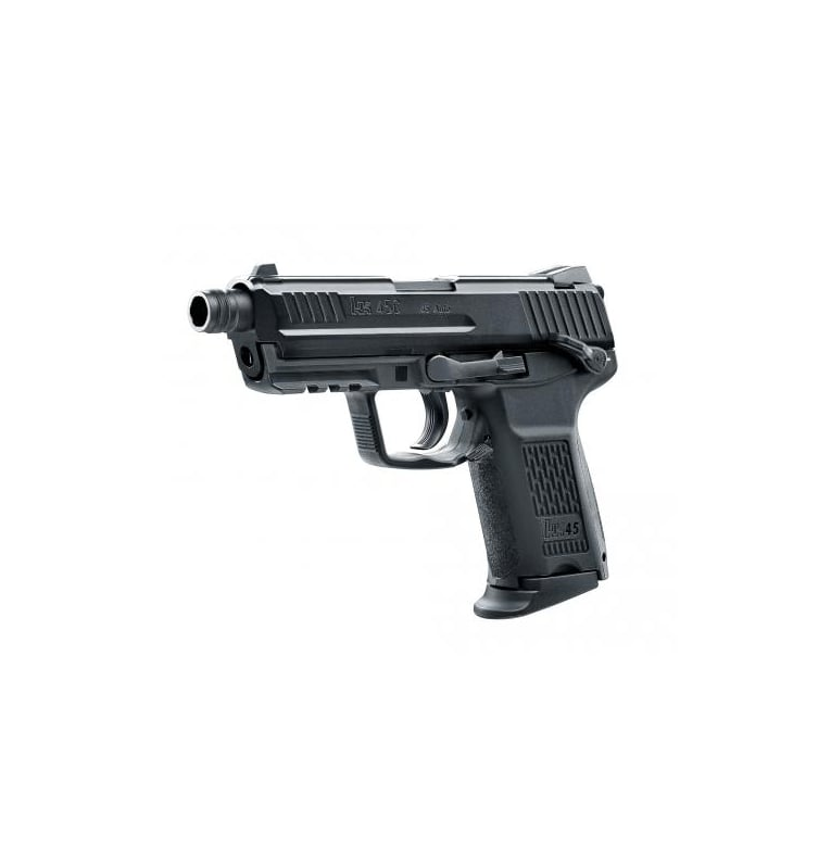 The HK45 is the largest-caliber pistol made by Heckler & Koch. The airsoft version with the abbreviation CT features a number of unusual details, such as a barrel with muzzle thread, a Picatinny rail, a magazine release in the trigger guard and a manual safety.