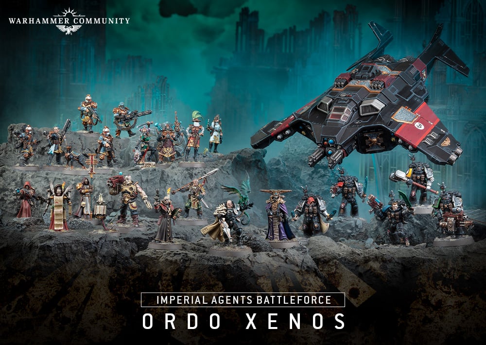 The insidious plots of the alien are covered by the Ordo Xenos, who may dispatch a strike force when the Space Marines or Astra Militarum are too slow, perhaps procuring valuable technology in the process… The Ordo Xenos battleforce is led by Lord Inquisitor Kyria Draxus, a radical who uses Xenos weapons. She battles alongside a Navigator, six Inquisitorial Agents with a Tome-skull, a Rogue Trader and her entourage, five Voidsmen-At-Arms and their loyal hound, and a squad of five Deathwatch Veterans riding a mighty Corvus Blackstar attack aircraft.