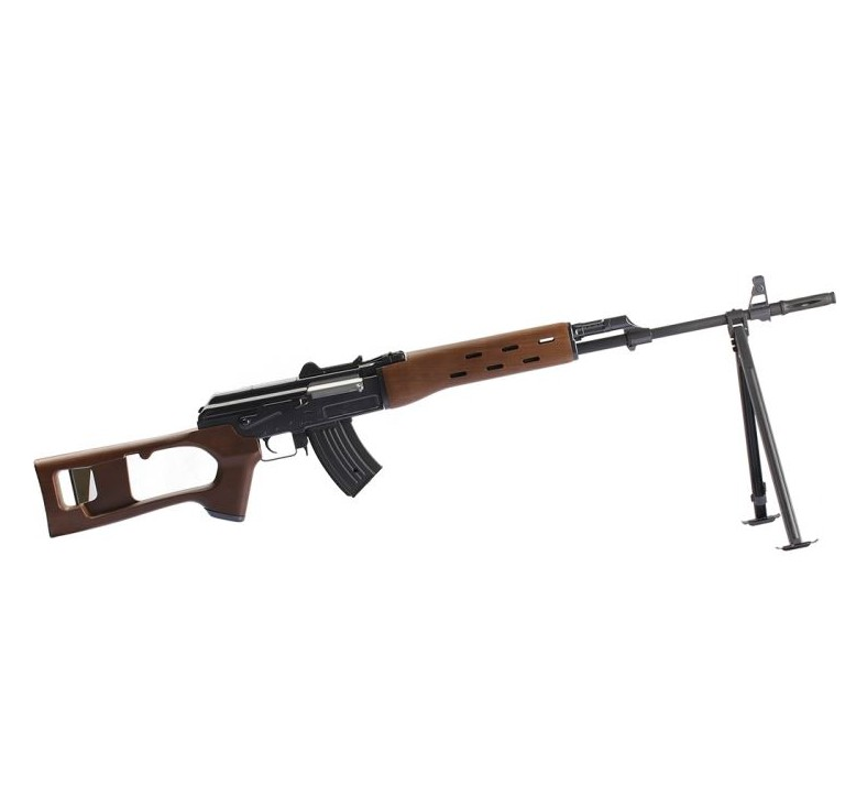 This model is based on the Dragunov sniper rifle but is built with an AK47 body and fires in both semi and full-auto. It has a plastic body and furniture for a much lighter weight, making it easier to carry. It has metal controls like the fire selector, top cover, cover release, etc, and a metal outer barrel and bipod. It has a really ergonomic feel and will make for an excellent AEG DMR base gun