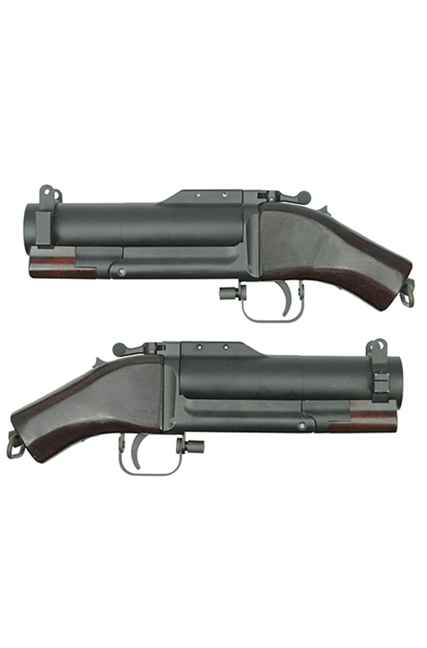 This M79 sawed-off grenade launcher is the mini version of the legendary M79 grenade launcher. The shorten barrel and stock, and the folding ladder-style leaf-type rear sight are removed to help to maintain batter maneuver for close battle or any other situations. Full metal builds with real wood hand-grip. The trigger guard can be rotated either to the left or right side by pushing the detent on the front.