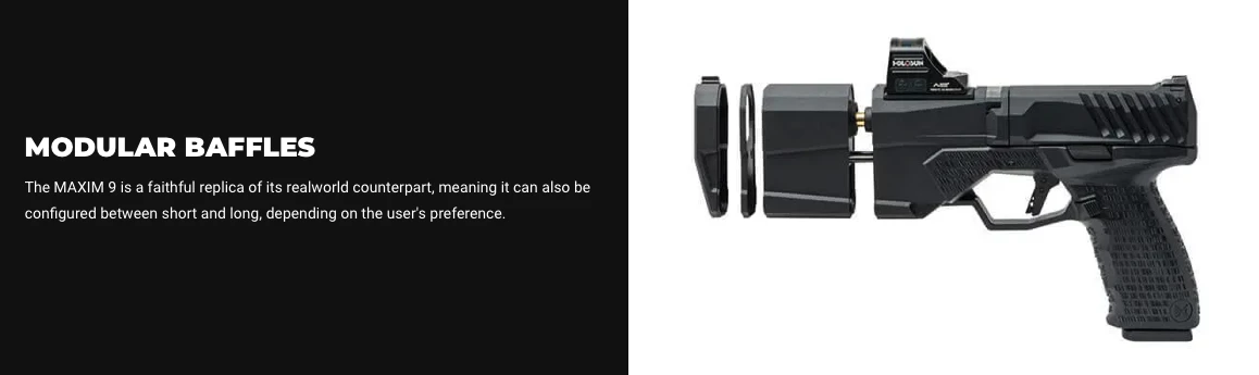 The SilencerCo® Maxim® 9, introduced in 2017, is the world’s first integrally suppressed 9mm pistol that is holster-able and hearing-safe with all types of ammunition. KRYTAC® have faithfully reproduced this groundbreaking handgun as a 6mm, green gas-powered, blowback airsoft pistol.