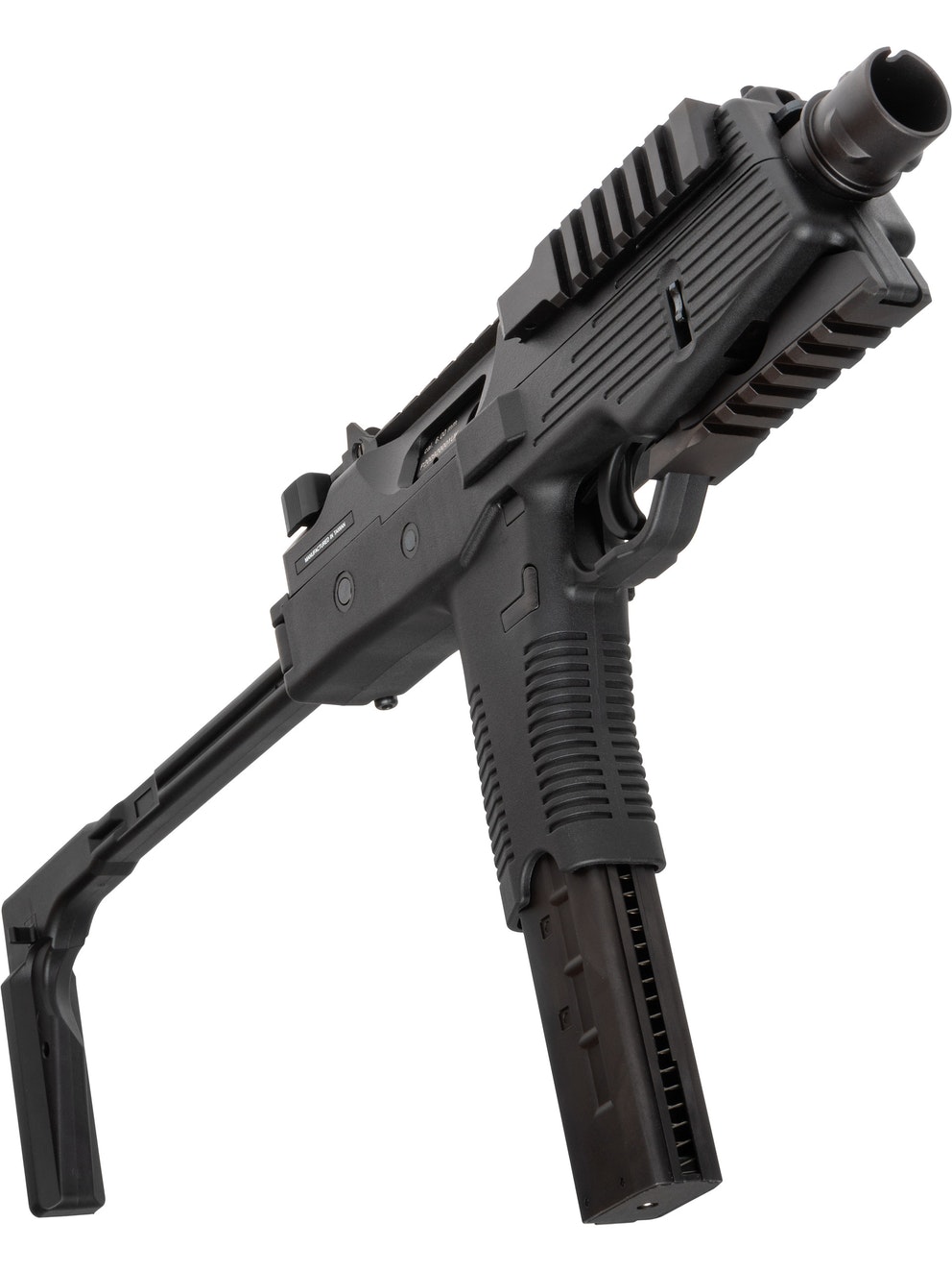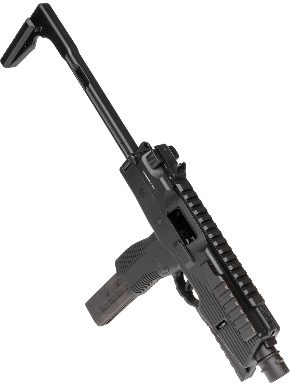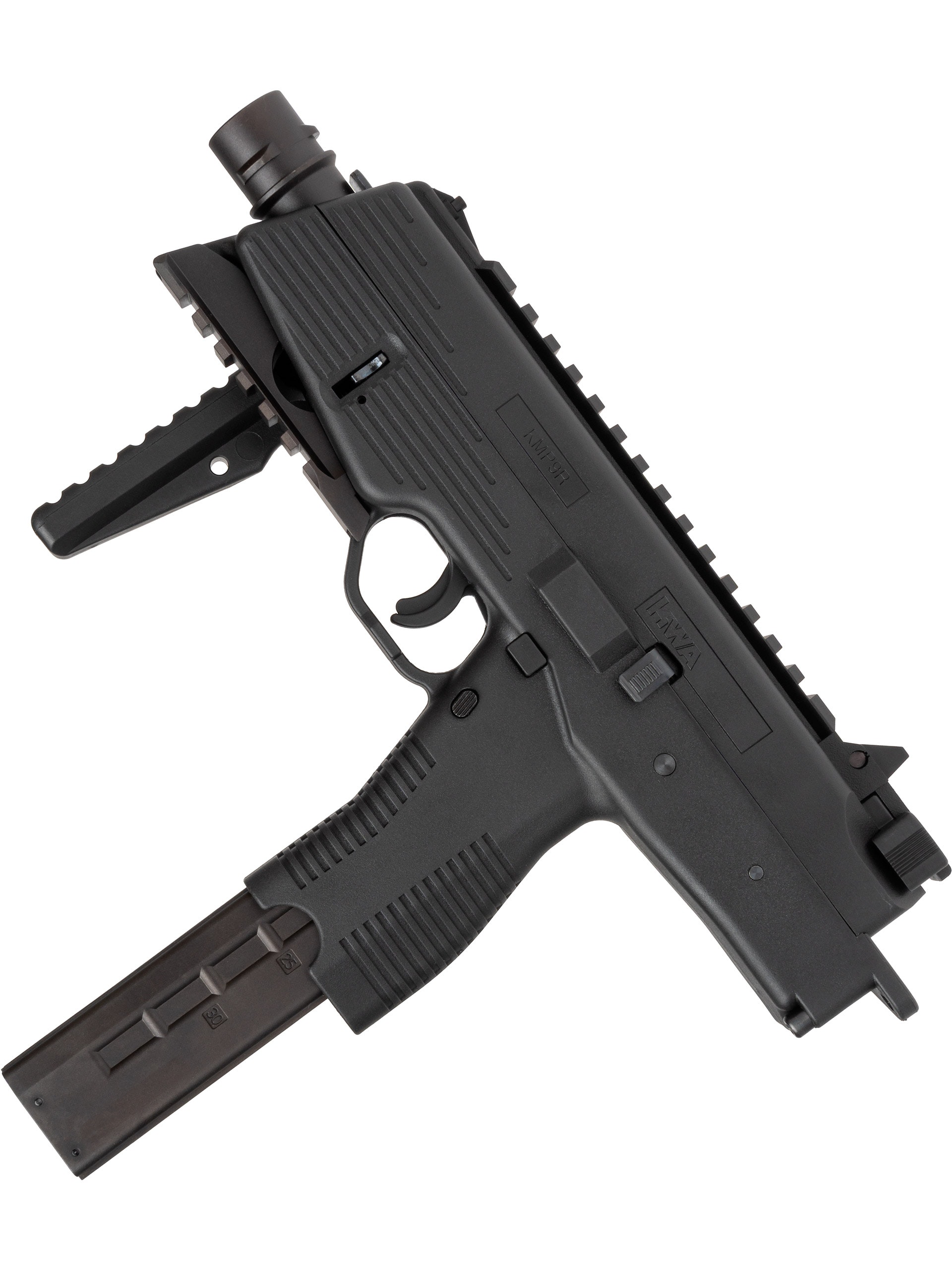 The MP9 is a compact gas blowback machine pistol. This version has a bottom rail and a folding stock and the whole body is made of reinforced fiber polymer. The whole construction of the MP9 is very realistic and it is field stripped like the real thing.