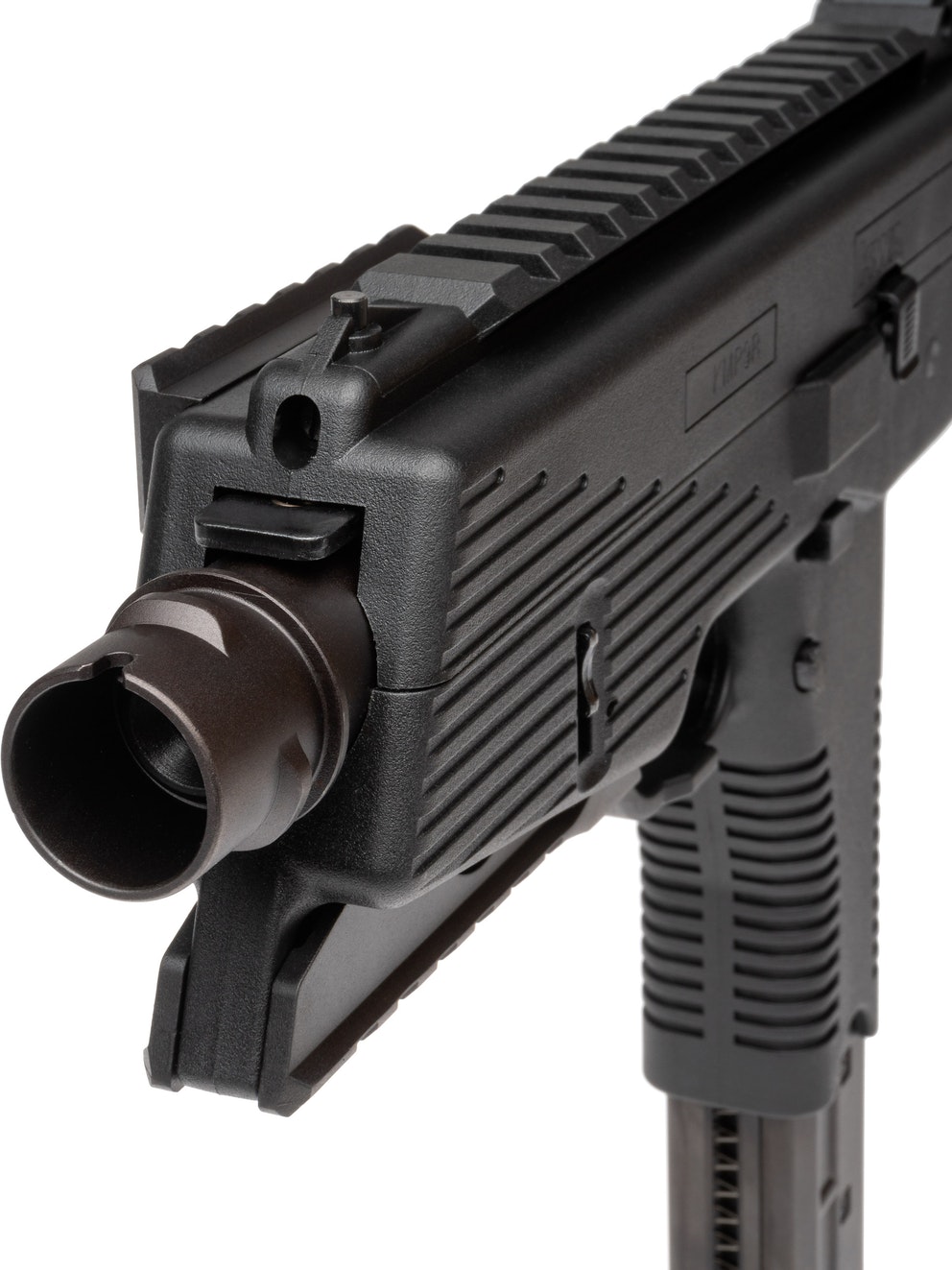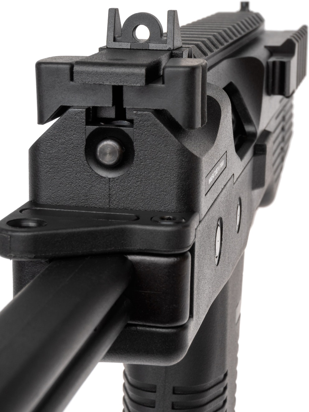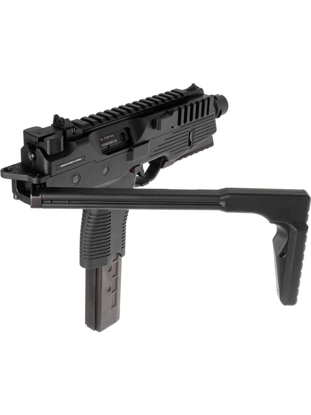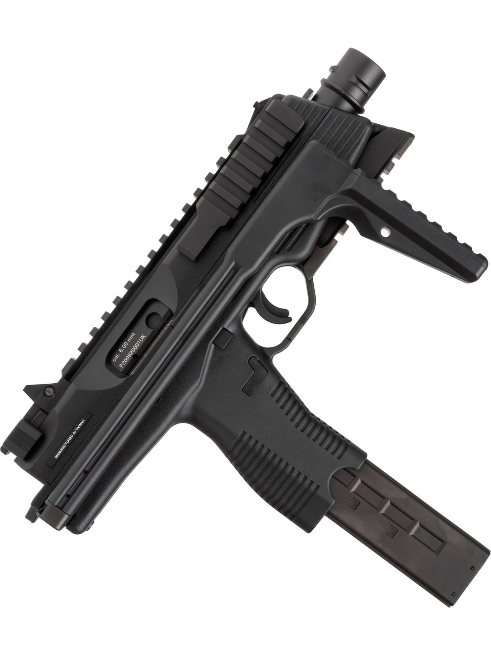 The MP9 is a compact gas blowback machine pistol. This version has a bottom rail and a folding stock and the whole body is made of reinforced fiber polymer. The whole construction of the MP9 is very realistic and it is field stripped like the real thing.