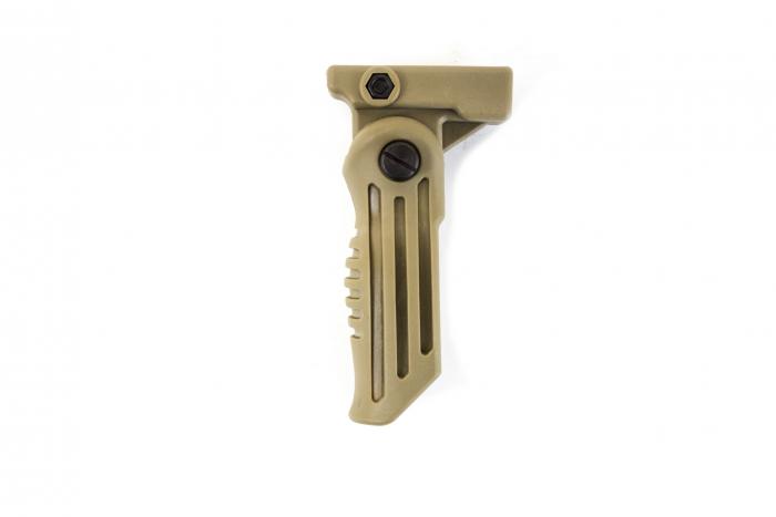 Folding grip for RIS Rails. Gives the user the choice of folding the grip up for a lower profile or at the push of the side button lets you fold the grip down to either an angled grip or straight down to be used as a normal vertical grip.