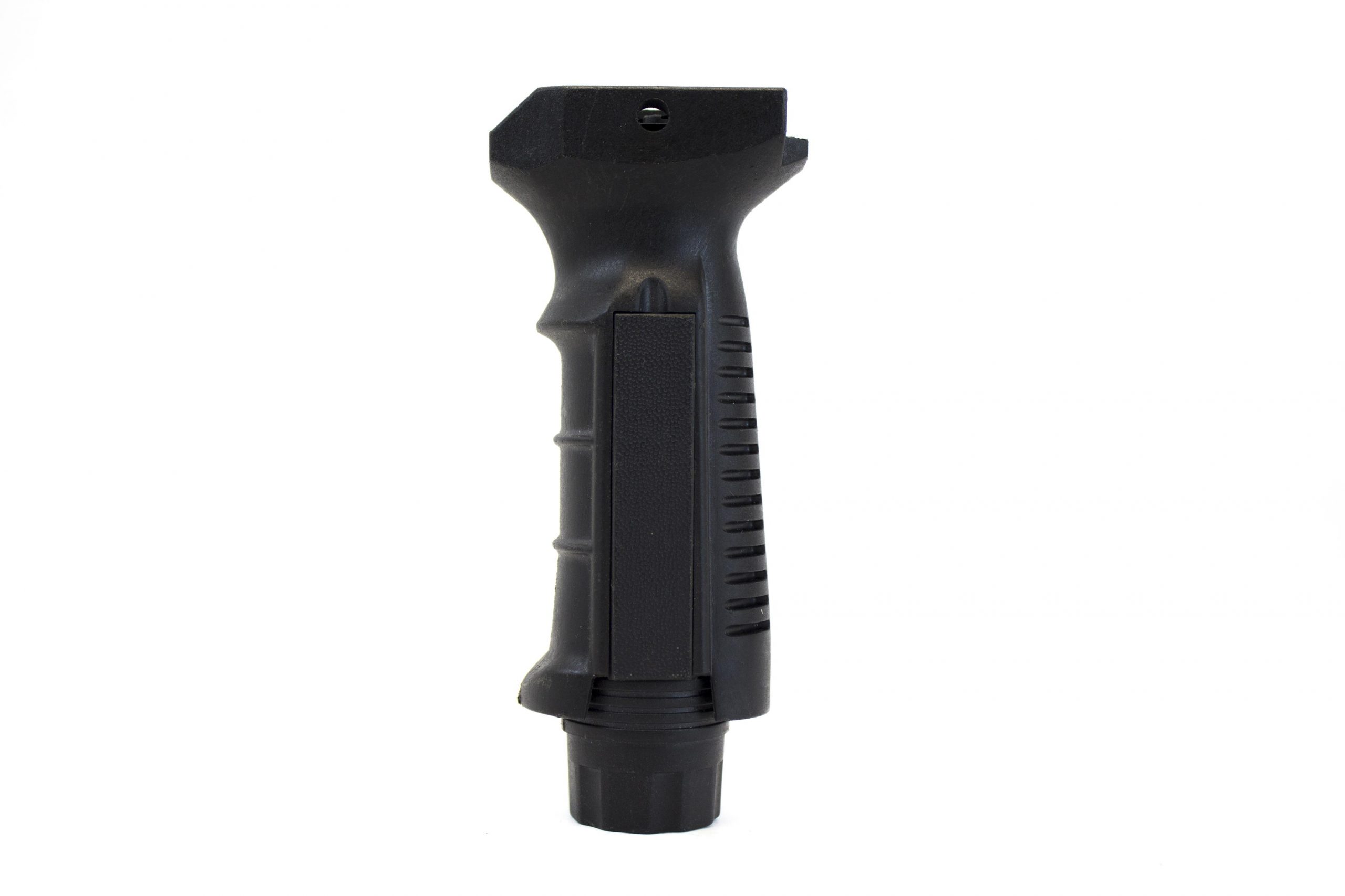 Vertical grip for RIS Rails. Contoured front edge for extra comfort. Removeable slots on the left and right sides of the grip enable the user to put in pressure pads for accessories like torches and lasers. The base cap of the grip unscrews letting you store spare batteries, up to 3 x CR123a’s.