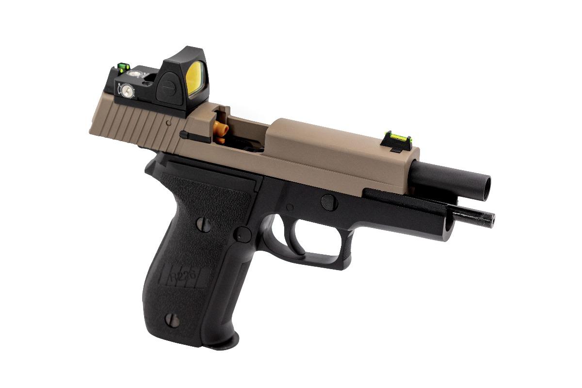 The R226 features an exceptionally ergonomic design. Everything from the pistol grip to the finish gives the R226 a level of comfort not found on many other GBB Pistols. The use of electrostatic painting methods ensures a non-porous, stain-resistant finish that will keep the R-Series looking its best for longer, game after game. The in-hand feel is further enhanced by the lightly textured pistol grip, wrapped around the rear of the grip, it feels like the R226 wants to force its way into the palm of your hand and not let go. The traditional chamfered, dual-action long pull trigger rounds off the feel-good shooting experience before we have even got onto the performance of the R226.