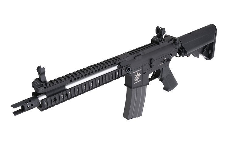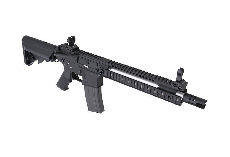 The replica is equipped with a top 22mm RIS rail, a set of front 22mm RIS rails and an adjustable stock. The top RIS rail holds the flip-up type iron aiming sights which can be easily detached and replaced with any optical-electronic aiming devices. Thanks to the collapsible stock which is ended with an anti-skid stock’s foot, it is possible to adapt the replica’s length to the built and the preferences of the shooter. The default muzzle flash-hider is placed on a 14mm counter-clockwise thread what allows the attachment of a sound suppressor in its place.