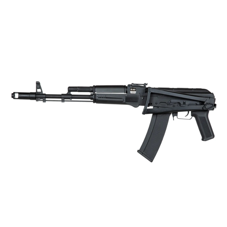 The replica features a very good fit of the parts, ergonomics, and low weight. Additionally, it comes equipped with the ESA2™ quick spring change system, which allows for easy adjustment of the power of the replica without the need to disassemble it. The replica also has a metal hop-up chamber, a 6.03mm diameter precision barrel, and a muzzle device on a 24mm CW/14mm CCW thread. It also has a “dovetail” type side mounting rail and plenty of room for a stick battery under the dust cover, making it LiPo-ready.