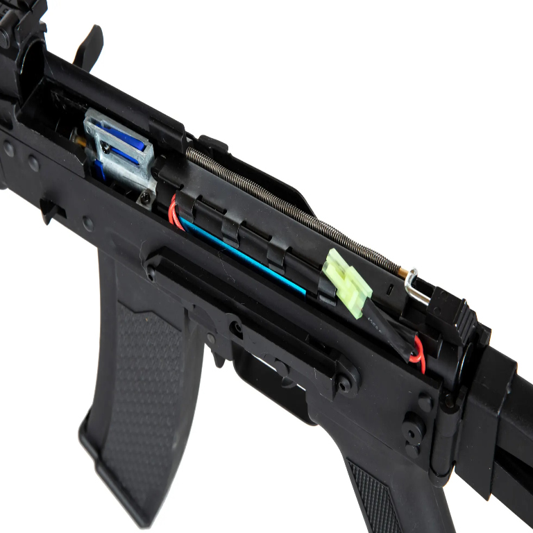 The gearbox of the replica has 8mm slide bearings and steel gears fitted on them and is secured by means of four anti-reversal latches. The replica also includes a polycarbonate plastic piston fitted with a full steel tappet plate, increasing its durability. The set does not include a battery or charger.
