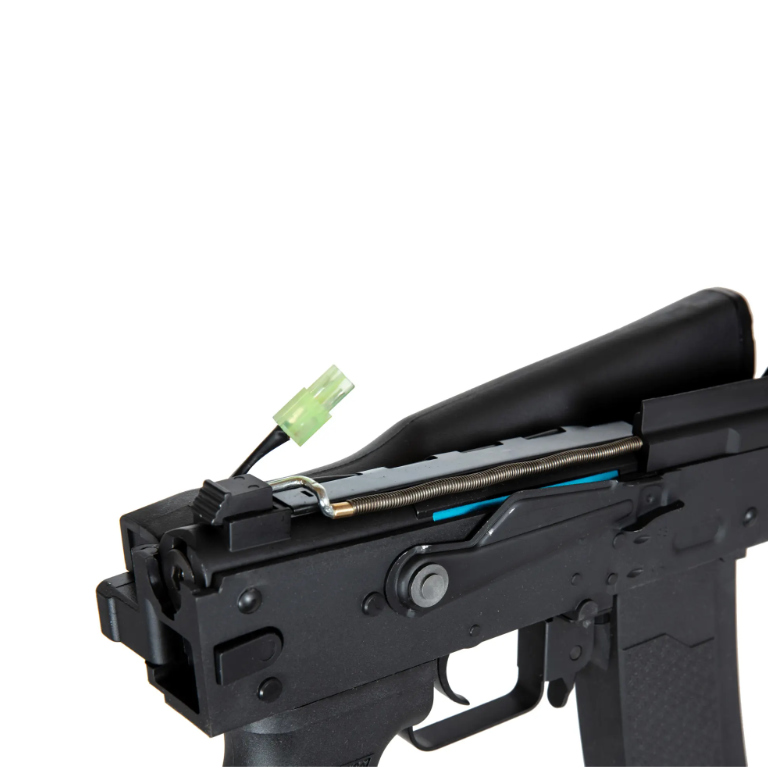 LiPo and LiFe batteries can be used with the replica thanks to complete adaptation. The replica is ideal for middle-range operations because of the baseline muzzle velocity of 380 FPS ensured by the factory-installed main spring. The set also comes with an M90 spring that enables you to lower the muzzle velocity to around 310 FPS, making the replica ideal for use up close or inside structures.