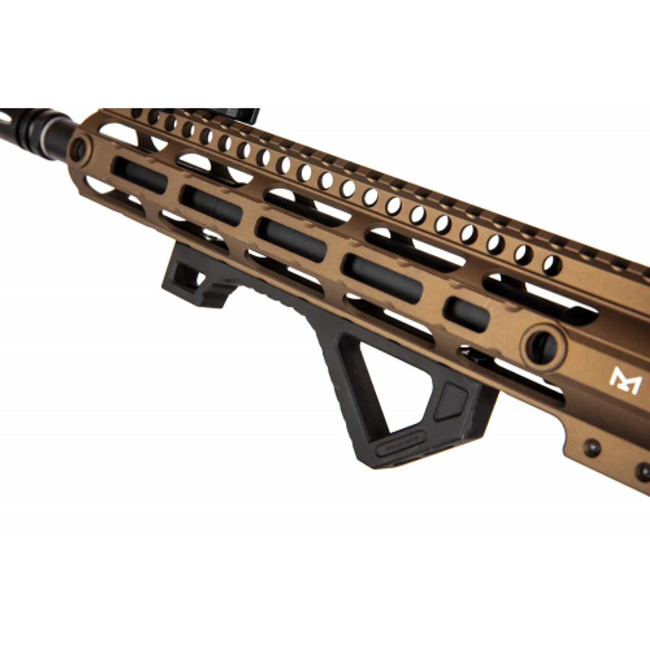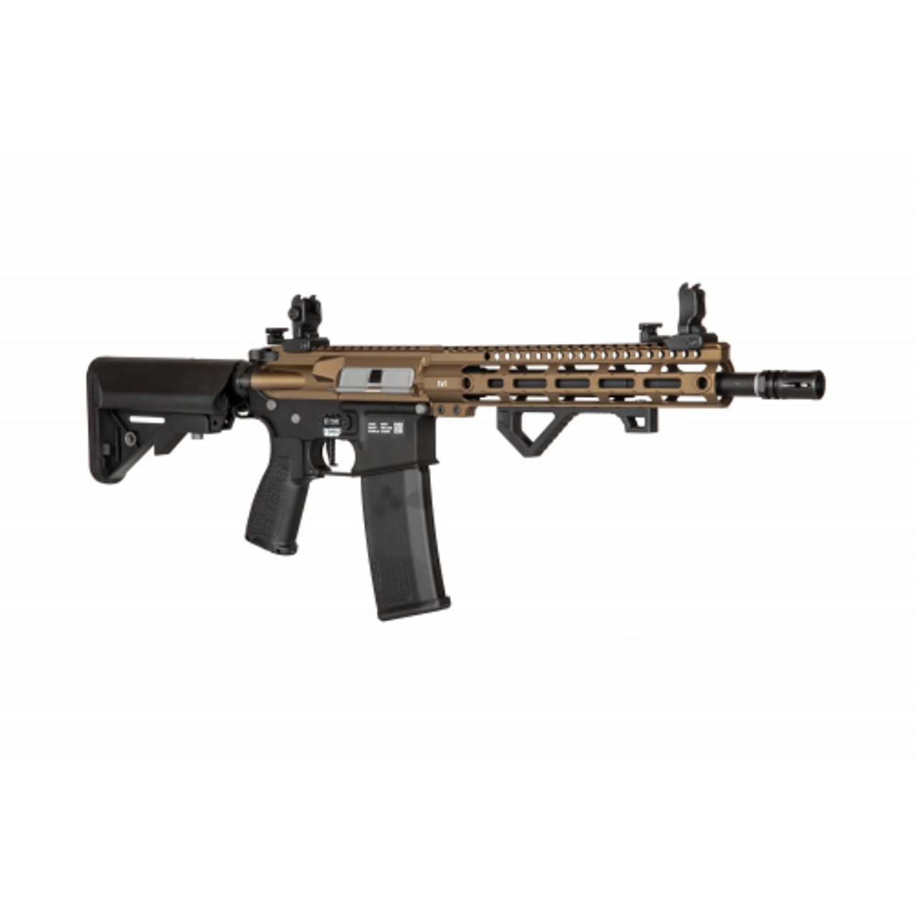The replica is equipped with an MLOK / RIS 22 mm handguard. The barrel features a standard muzzle device on a 14 mm CCW thread. The top of the replica features flip-up iron sights.