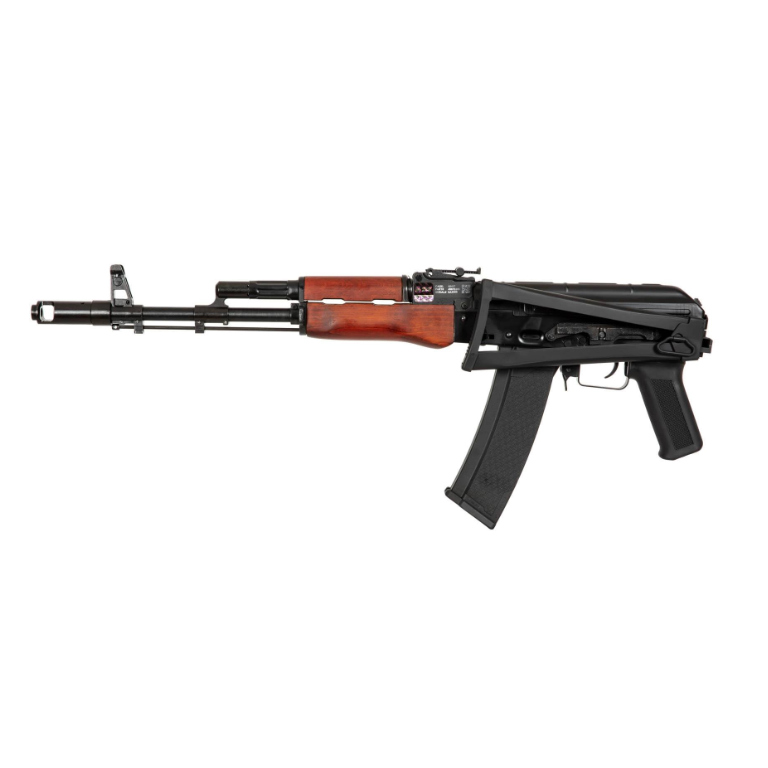 The Specna Arms J-Series carbine replicas are mostly made of steel. The receiver, dust cover, external barrel, trigger guard, magazine latch, fire mode selector plate, gas pipe, and muzzle are all made of steel.