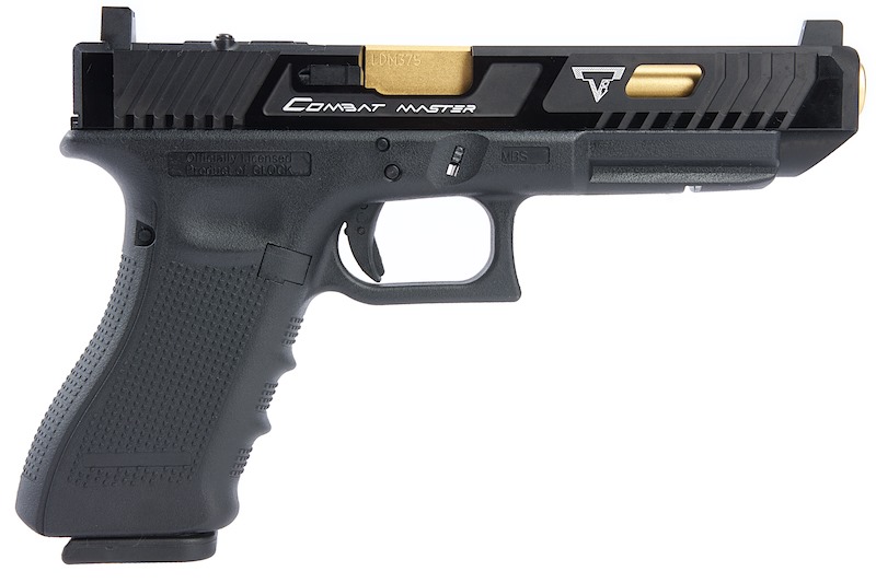 The EMG TTI Glock 34 style pistol is a fully licensed product built on the Umarex Glock 17 Gen 4 pistol. This particular style comes in a two-tone silver and grey finish. The silver accents are polished and the grey parts of the slide offer it great contrast, finished off with a gold barrel for a classy look. The TTI pistol being fully licensed will feature all the same markings as seen in the John Wick movie as well as the same serrations to aid in manipulation.