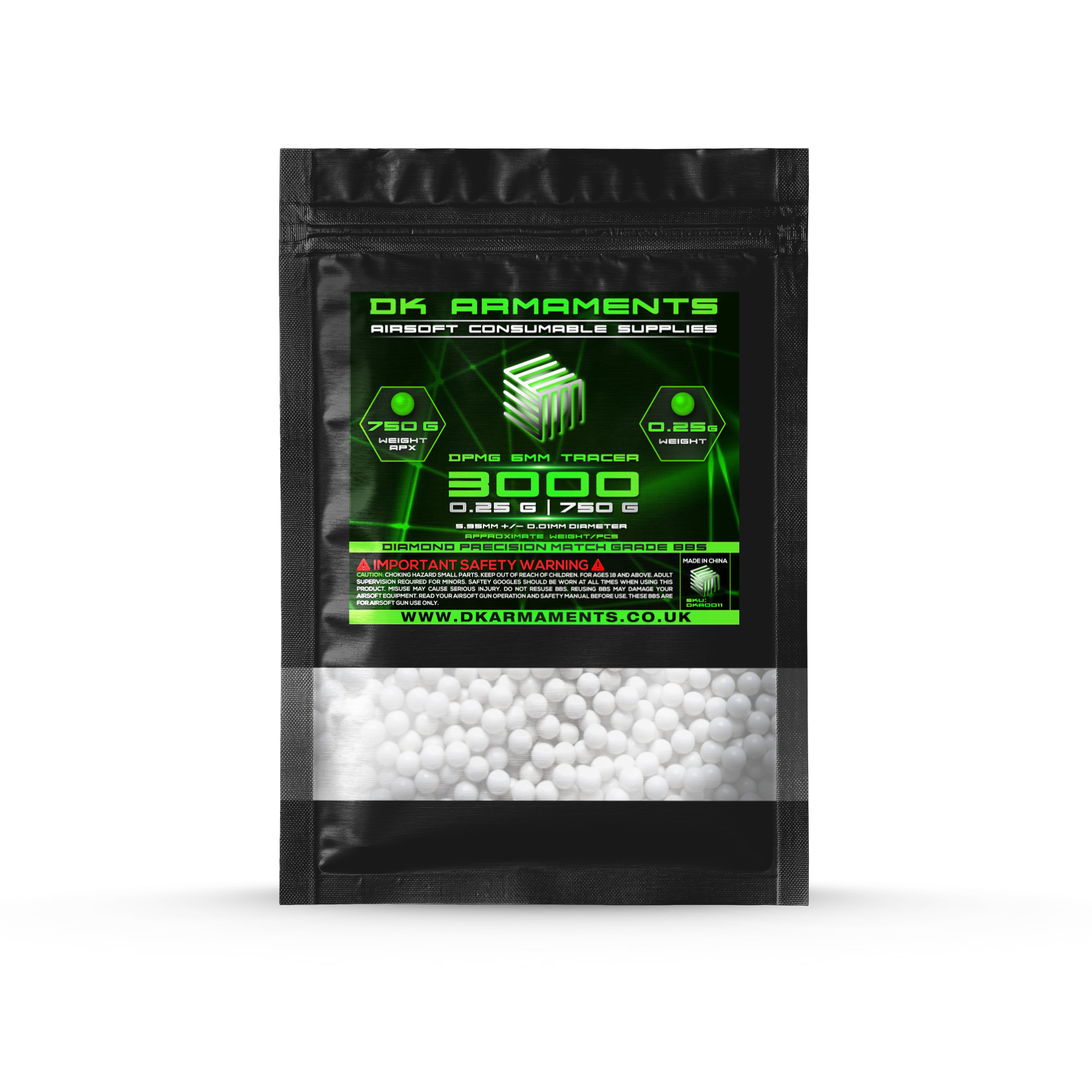DK ARMAMENTS 0.25g Diamond Precision Match Grade (DPMG) TRACER BBs offer the Airsoft player consistent precision and ultimate performance. It is constructed from high-quality, high-density polymers and is double polished to provide its high gloss finish. The polishing process ensures that the 0.25g BB is fully spherical in shape with no ridges, blips, or seams designed for exceptional aerodynamics.