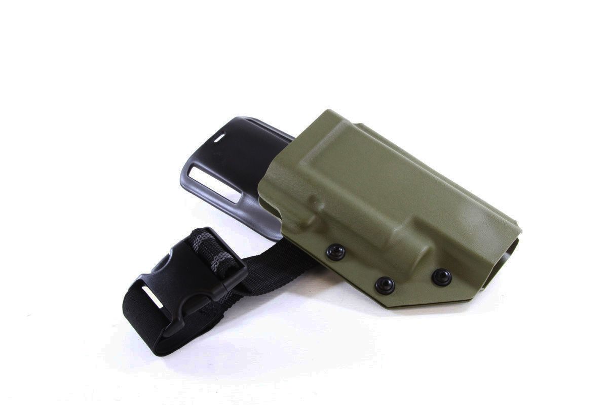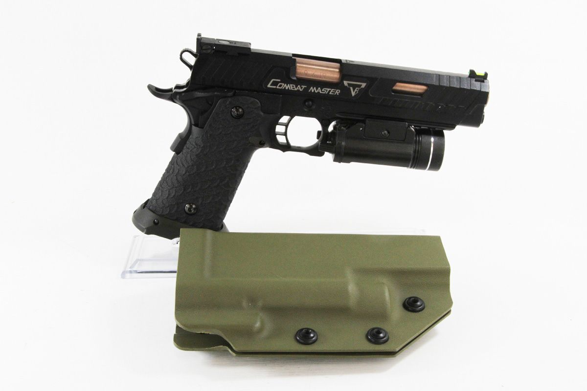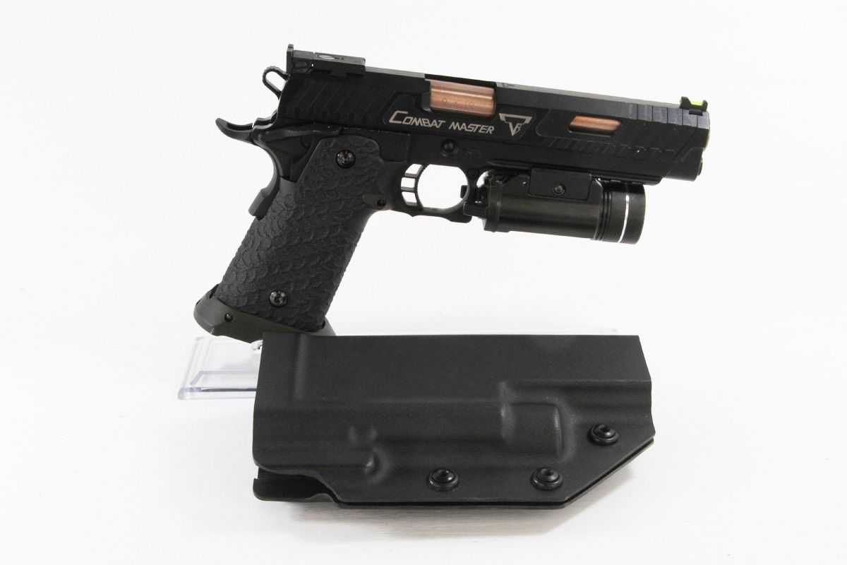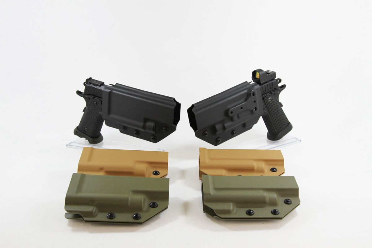 Our DC-5 Series TLR Holster uses your attached torch for retention, meaning you can run your favorite tracer alongside your torch. If you run the same torch on multiple weapons, then this is the holster for you. After extensive testing of over 150 pistols, we only found 3 pistols that wouldn’t fit; the full-size Desert Eagle, ASG USW and the Hudson. Our DC-5 Series will fit the bigger frame guns, like the FNX pistols, weapons with wide trigger guards, like the AAP and pistols with taller slides like the 1911.