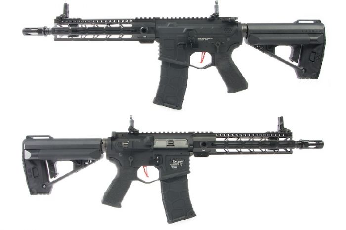 The VFC Samurai Edge is the latest AEG coming from VFC. Externally the gun is designed beautifully with billet style receivers and even sports a silver Samurai motif on the lower receiver. In conjunction with the eye-catching receiver sets, the gun comes with a fluted outer barrel and a slimline-designed M-Lok compatible rail with sufficient Picatinny rail slots on the 12 o’clock position up front for mounting lights or lasers. The Samurai Edge features the VFC designed QRS Stock and uses the same series of magazines giving it a modern and sleek look. As a final touch, the gun shows off a red “lightning” trigger.