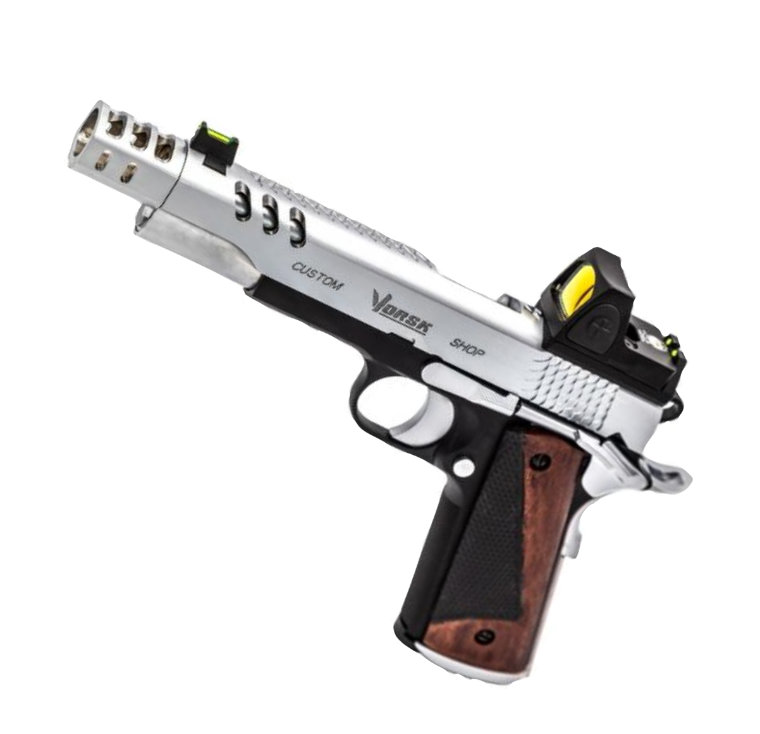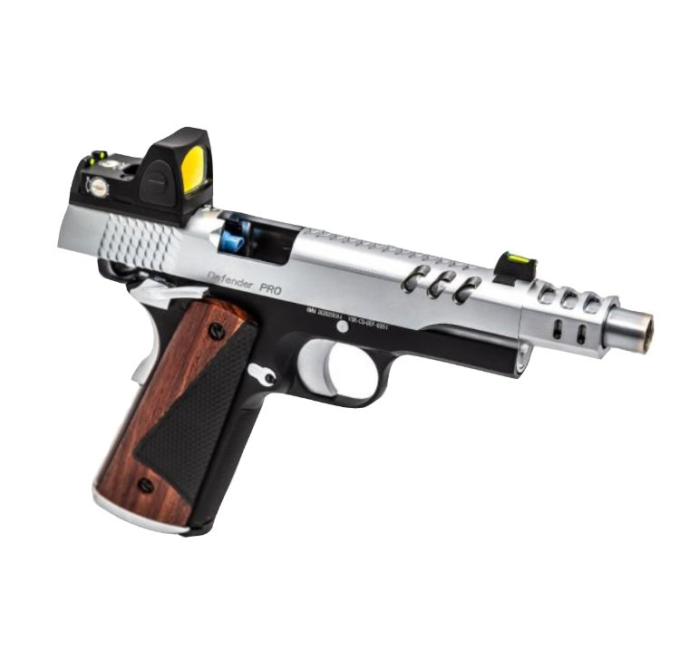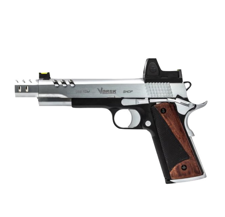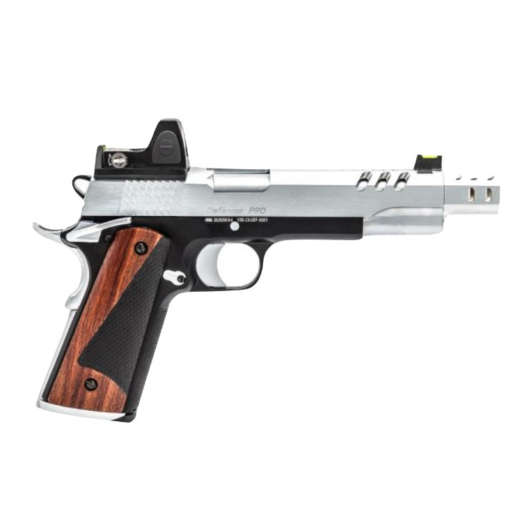 The DEFENDER PRO has an entirely new slide featuring 3 forward vent ports, a top slide ripple pattern and rippled slide grips. The design of the vent ports has been incorporated unto a new “twist and click” moderator that is very easy to remove. Included is a spare barrel bushing if it is the non-moderated look that is required. The pistol grips are a split wood/polymer construction, this leads to a striking design. Finally, a solid trigger is being used for the first time on a VORSK model.