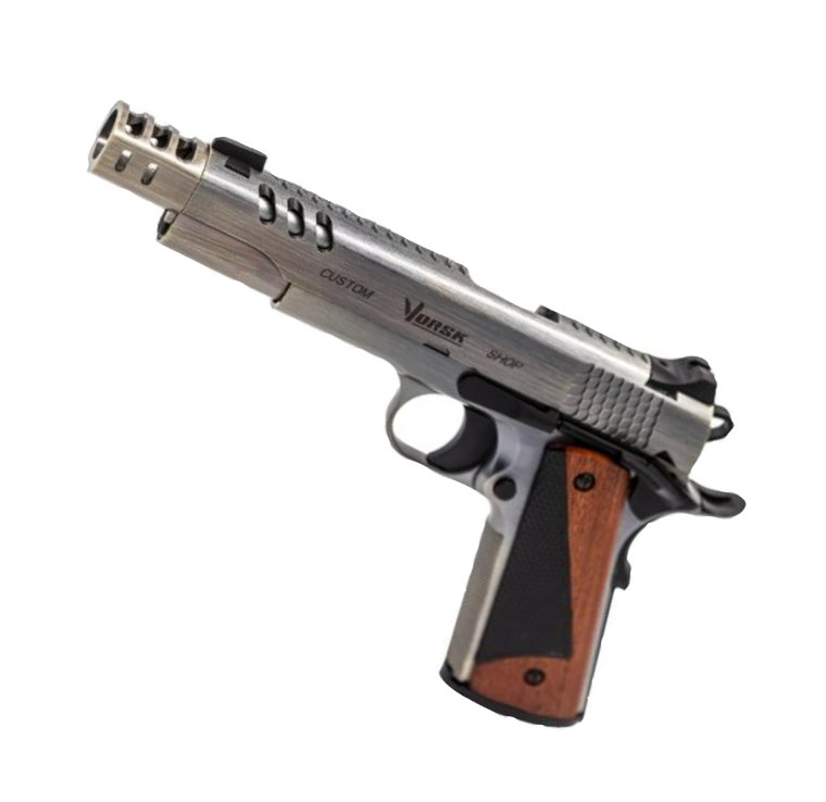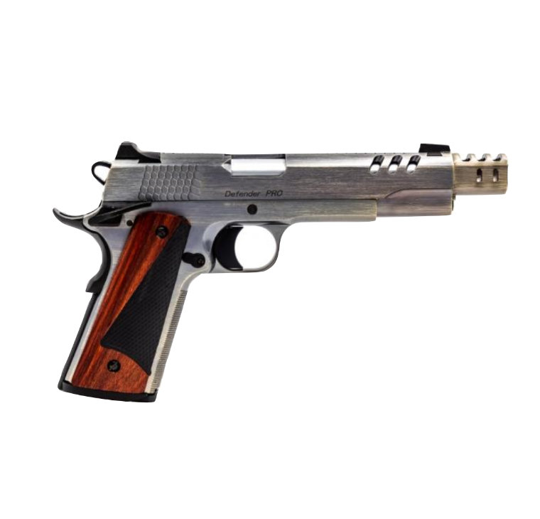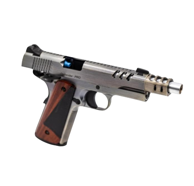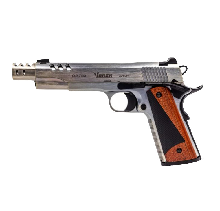 The DEFENDER PRO has an entirely new slide featuring 3 forward vent ports, a top slide ripple pattern and rippled slide grips. The design of the vent ports has been incorporated unto a new “twist and click” moderator that is very easy to remove. Included is a spare barrel bushing if it is the non-moderated look that is required. The pistol grips are a split wood/polymer construction, this leads to a striking design. Finally, a solid trigger is being used for the first time on a VORSK model.