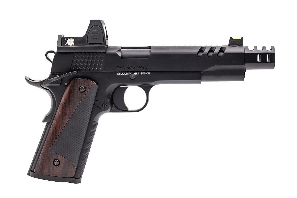 The DEFENDER PRO has an entirely new slide featuring 3 forward vent ports, a top slide ripple pattern and rippled slide grips. The design of the vent ports has been incorporated unto a new “twist and click” moderator that is very easy to remove. Included is a spare barrel bushing if it is the non-moderated look that is required. The pistol grips are a split wood/polymer construction, this leads to a striking design. Finally, a solid trigger is being used for the first time on a VORSK model.