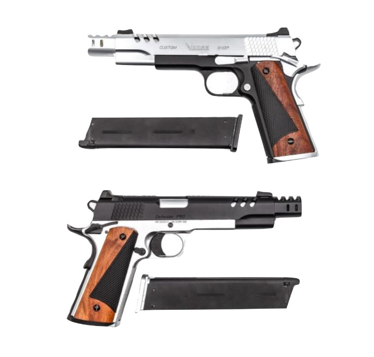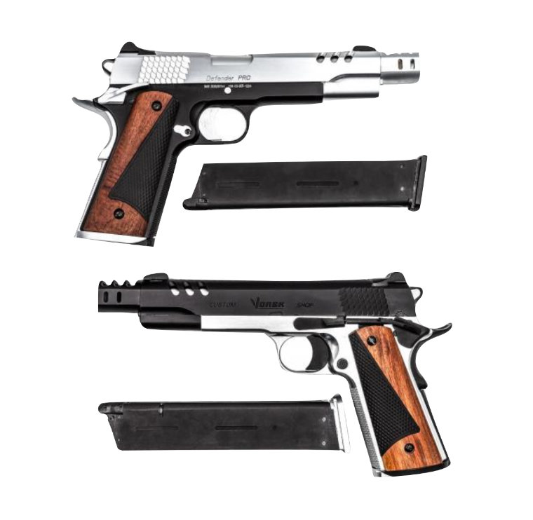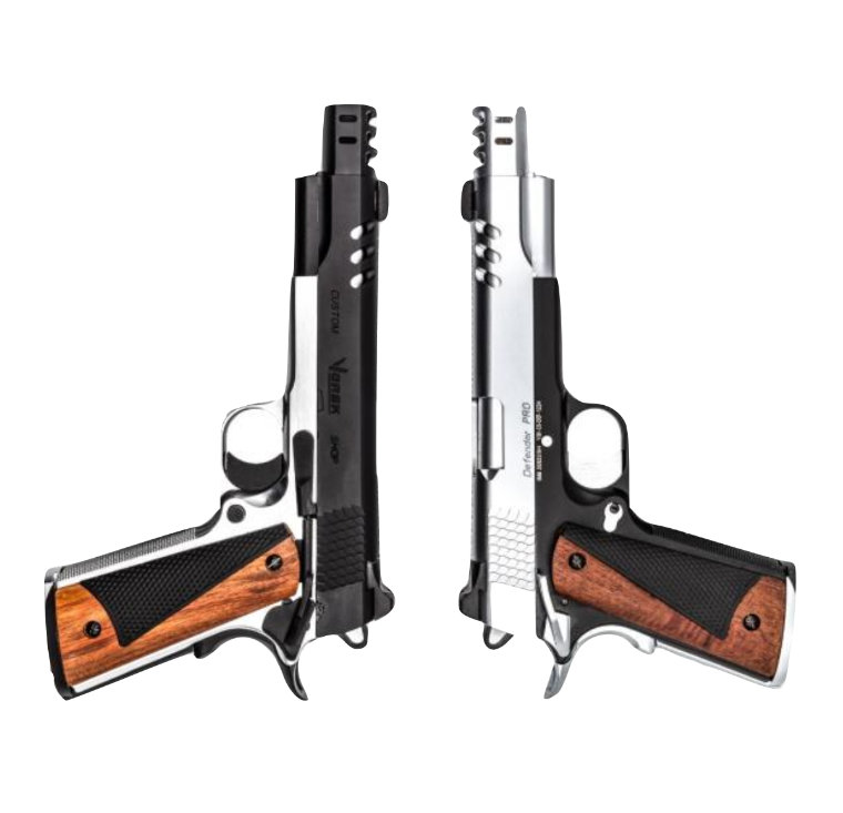 The DEFENDER PRO has an entirely new slide featuring 3 forward vent ports, a top slide ripple pattern and rippled slide grips. The design of the vent ports has been incorporated unto a new “twist and click” moderator that is very easy to remove. Included is a spare barrel bushing if it is the non-moderated look that is required. The pistol grips are a split wood/polymer construction, this leads to a striking design. Finally, a solid trigger is being used for the first time on a VORSK model.