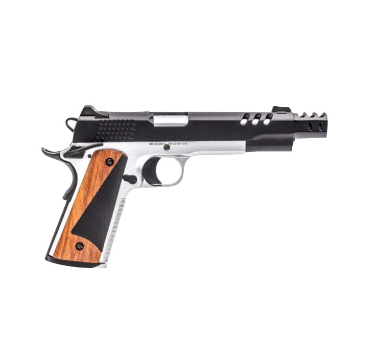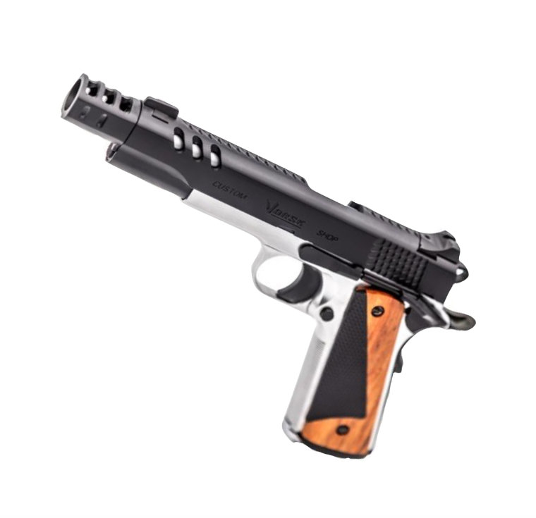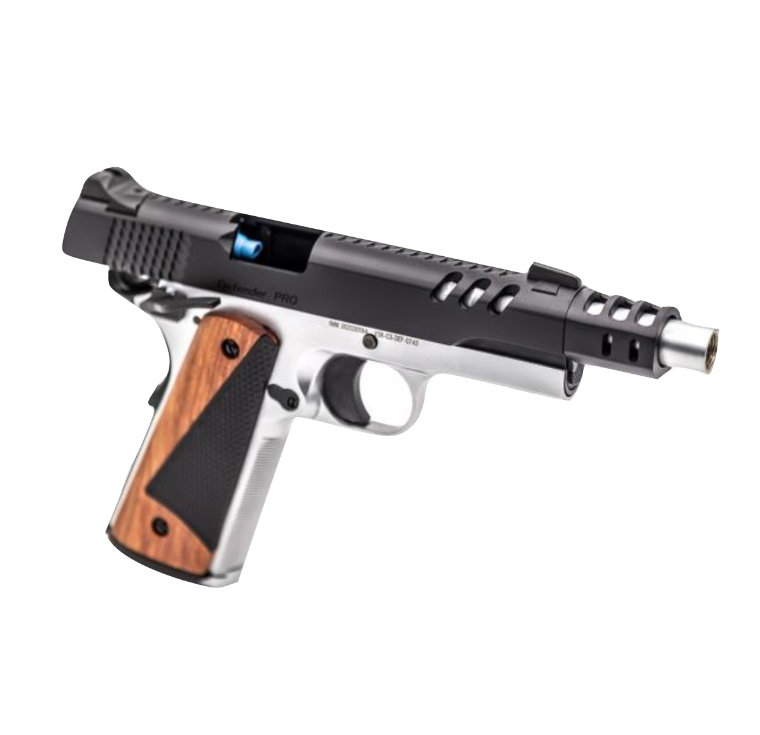 The DEFENDER PRO has an entirely new slide featuring 3 forward vent ports, a top slide ripple pattern and rippled slide grips. The design of the vent ports has been incorporated unto a new “twist and click” moderator that is very easy to remove. Included is a spare barrel bushing if it is the non-moderated look that is required. The pistol grips are a split wood/polymer construction, this leads to a striking design. Finally, a solid trigger is being used for the first time on a VORSK model.
