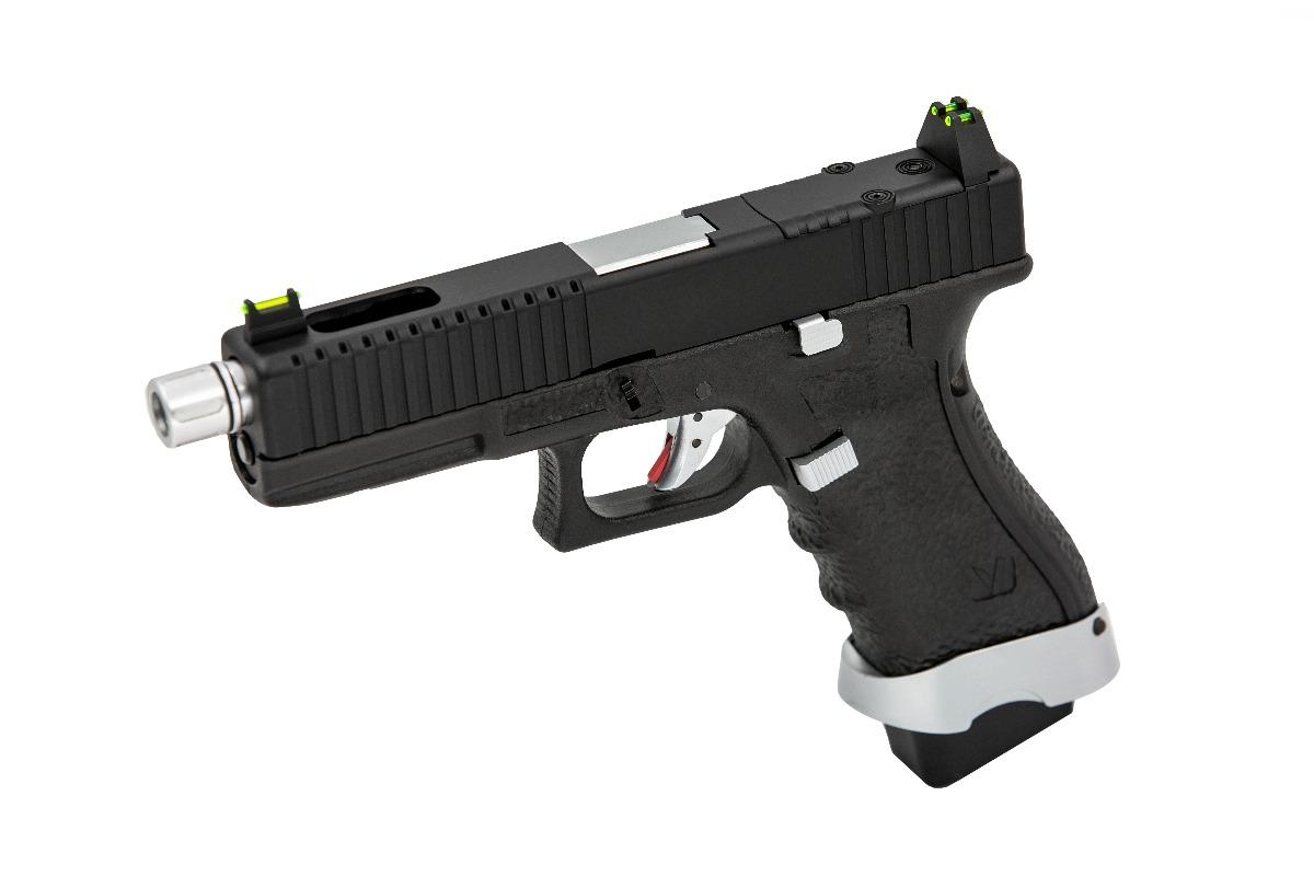 The VENTED slides distinctive forward vent ports give this EU platform its unique look. These “windows” look unto the fluted outer-barrel that is generally an alternative colour to the slide providing a truly different & eye-catching look. The vent ports also result in some slide weight-reduction which enhances the shooting experience as the recoil cycle is both faster & more “snappy” when compared to standard EU series GBB replicas. As mentioned above, the fluted outer barrel is often a chrome finish, along with the rest of the pistols frame mounted furniture that often results in a “triple-coloured” replica (eg. Tan, Black & Chrome) with some exceptions.