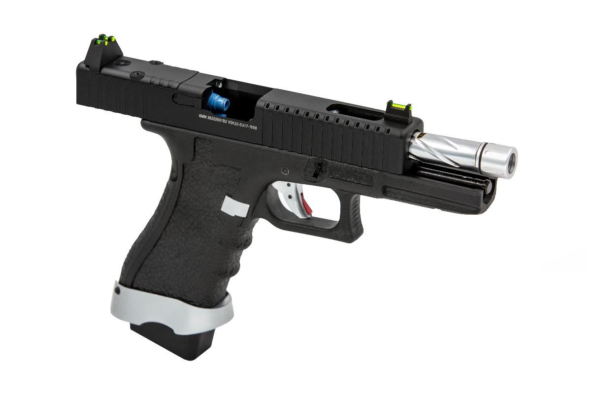 All models are enhanced with design choices not found on standard EU series replicas. Raised fibreoptic iron sights improve target acquisition, VORSKs high-stipple polymer pistol grip ensures a firm grip on those wet & windy days, further improved by the flared magwell. The notch in the magwell flare along with extended magazine baseplates improve reload speeds and finally all models come fitted with a 12 mm CW to 14 mm CCW thread adapter hidden underneath a barrel flash hider/ cover.