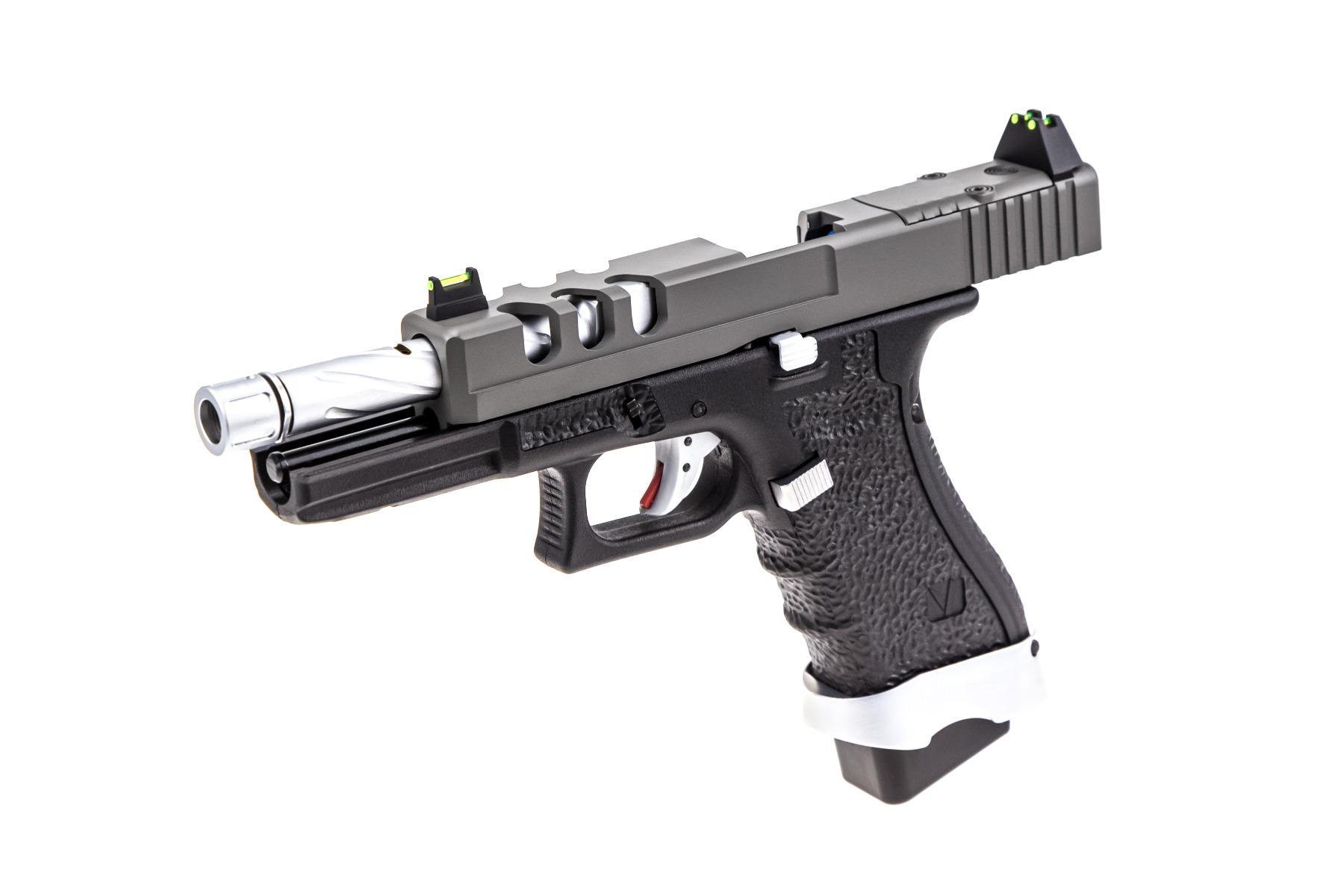 The VENTED slides distinctive forward vent ports give this EU platform its unique look. These “windows” look unto the fluted outer-barrel that is generally an alternative colour to the slide providing a truly different & eye-catching look. The vent ports also result in some slide weight-reduction which enhances the shooting experience as the recoil cycle is both faster & more “snappy” when compared to standard EU series GBB replicas. As mentioned above, the fluted outer barrel is often a chrome finish, along with the rest of the pistols frame mounted furniture that often results in a “triple-coloured” replica (eg. Tan, Black & Chrome) with some exceptions.