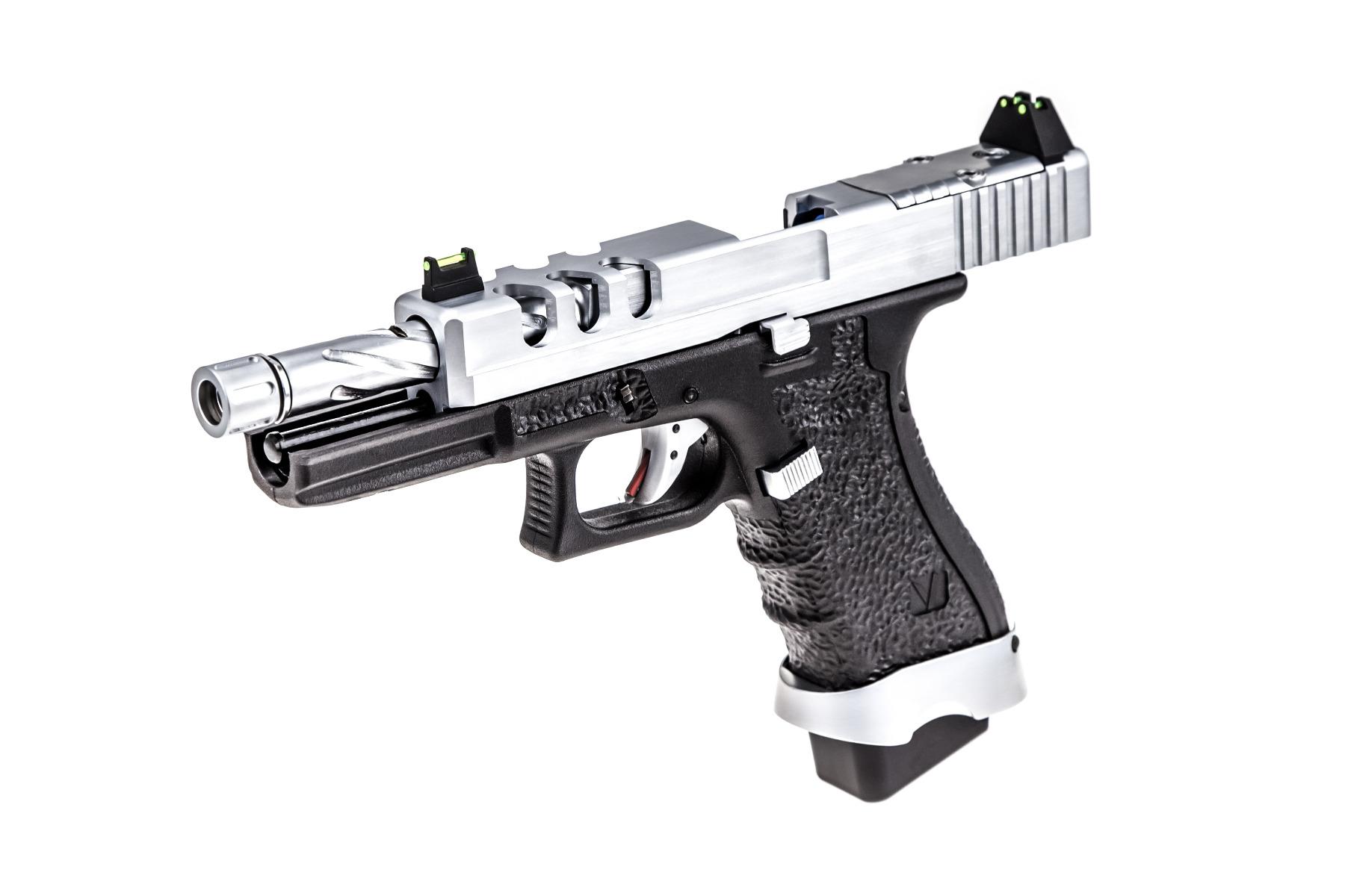 The VENTED slides distinctive forward vent ports give this EU platform its unique look. These “windows” look unto the fluted outer-barrel that is generally an alternative colour to the slide providing a truly different & eye-catching look. The vent ports also result in some slide weight-reduction which enhances the shooting experience as the recoil cycle is both faster & more “snappy” when compared to standard EU series GBB replicas. As mentioned above, the fluted outer barrel is often a chrome finish, along with the rest of the pistols frame mounted furniture that often results in a “triple-coloured” replica (eg. Tan, Black & Chrome) with some exceptions.
