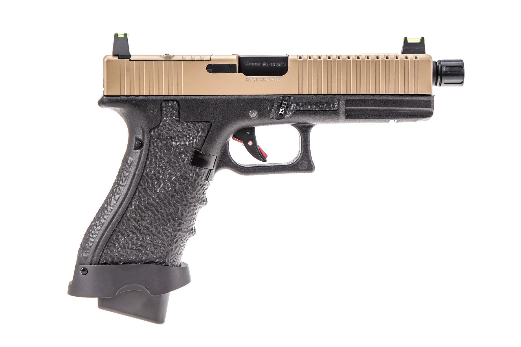 The VENTED slides distinctive forward vent ports give this EU platform its unique look. These “windows” look unto the fluted outer-barrel that is generally an alternative colour to the slide providing a truly different & eye-catching look. The vent ports also result in some slide weight-reduction which enhances the shooting experience as the recoil cycle is both faster & more “snappy” when compared to standard EU series GBB replicas. As mentioned above, the fluted outer barrel is often a chrome finish, along with the rest of the pistols frame mounted furniture that often results in a “triple-coloured” replica (eg. Tan, Black & Chrome) with some exceptions.