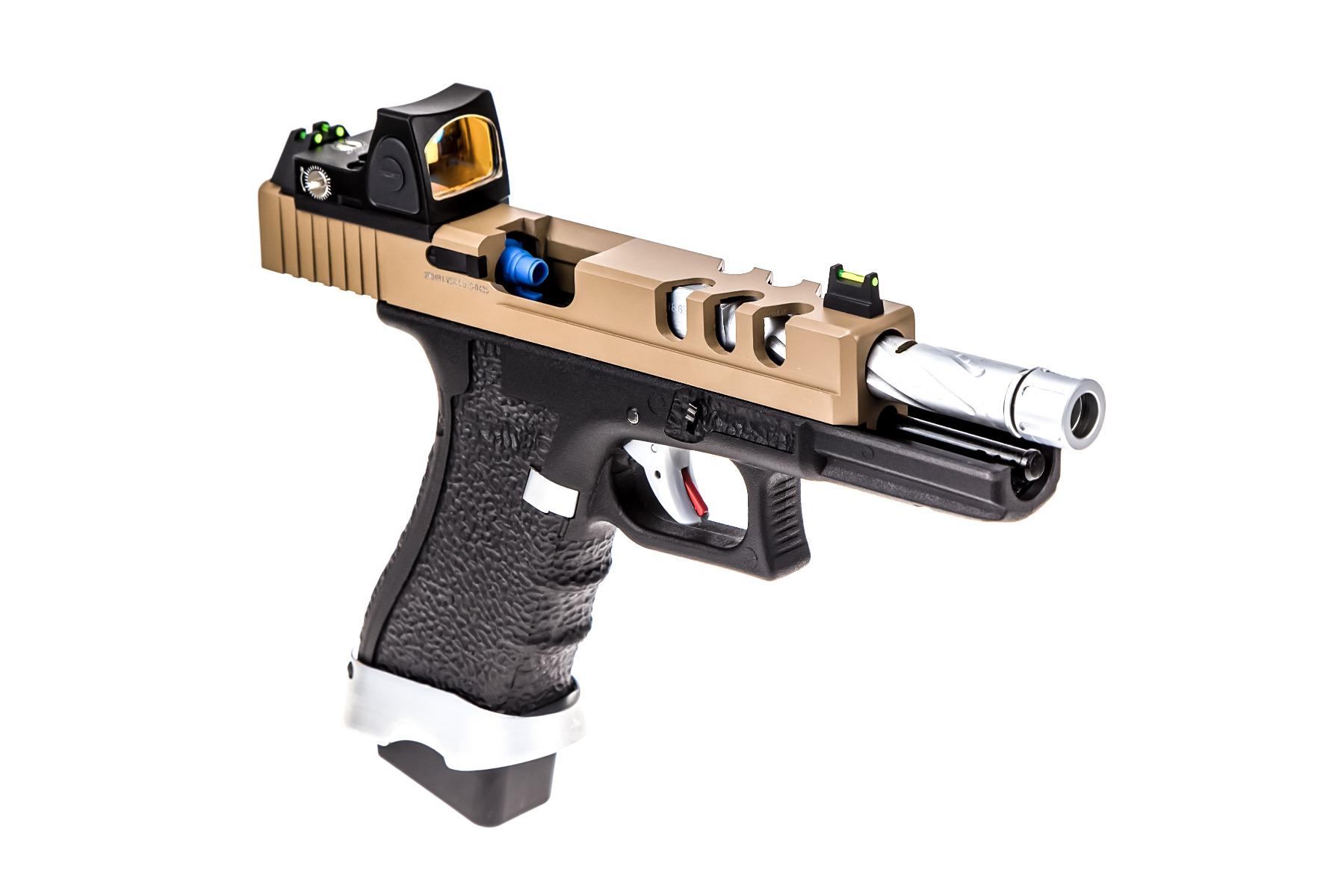 The TACTICAL option features a full-weight Aluminium Alloy Slide that features deep-groove ridge cuts on the forward & rear slide sections to help improve slide grip when racking your first BB. Colour choices are more reserved for the TACTICAL options, with all of the furniture & frame remaining black when choosing different slide colours (excluding GOLD & CHROME that have their furniture in the same colour as the slide).