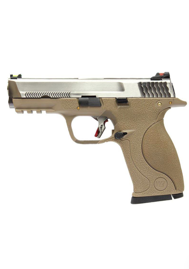 WE Custom Big Bird Tan (Silver Slide and Silver Barrel). BIG BIRD with Custom WE-Tech FORCE Series Upgrades. SILVER Stealth Vented Slide. TAN frame with custom stippling. SILVER Barrel with 9mm engraving on chamber